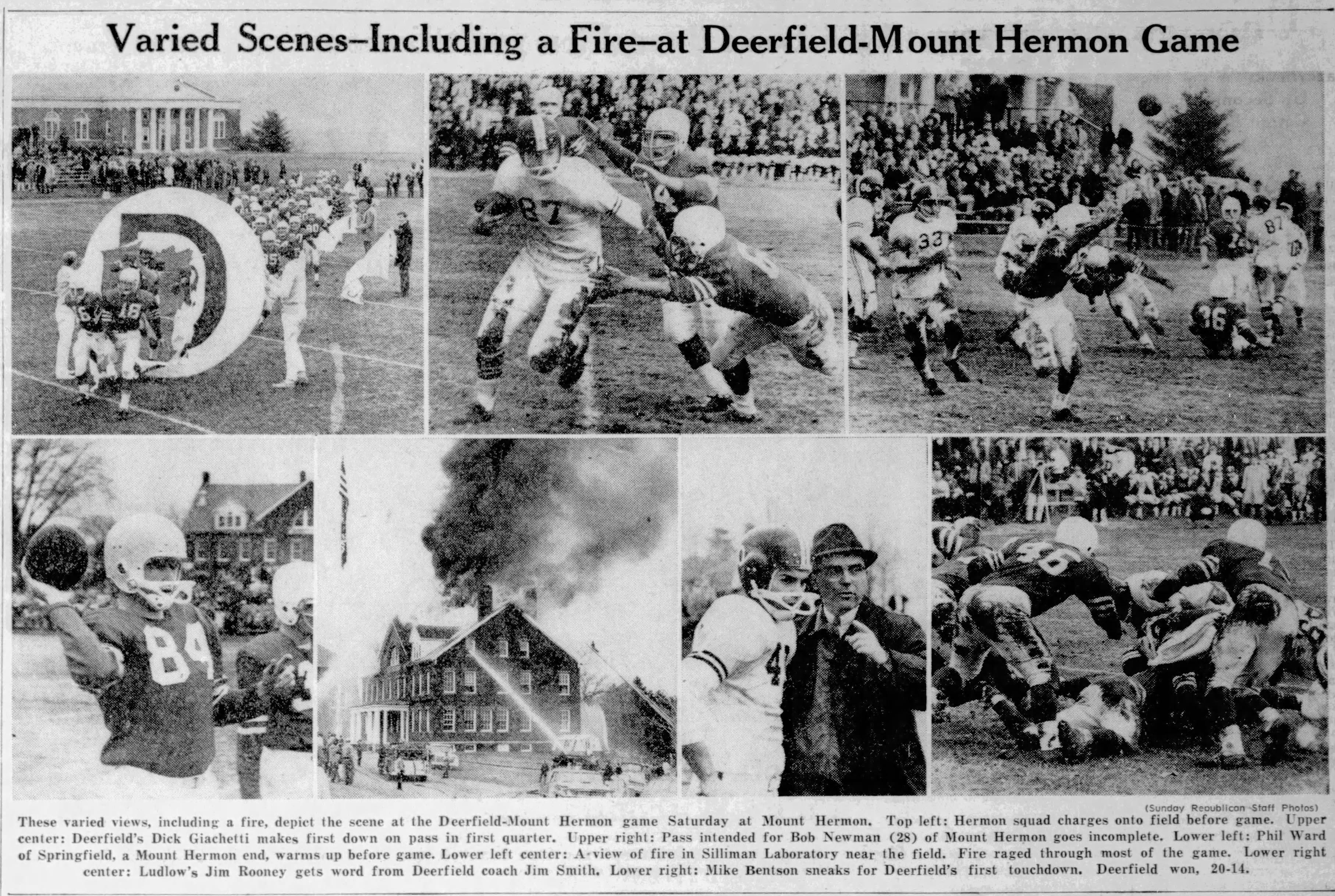 However, not everyone stayed to watch the game. Mount Hermon’s backfield coach, Don Westin, the school’s science department chair when not coaching, decided his scientific and teaching duties superseded his assistant’s roles, so he quickly left the sidelines, running into Silliman Hall to save some lab equipment from the burning building.