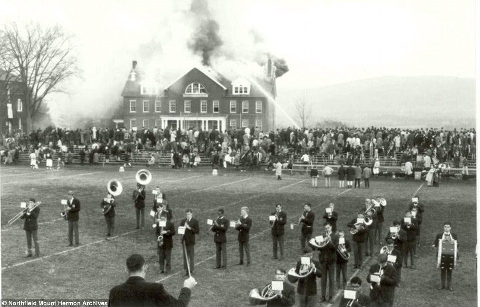This article concerns a picture that is worth 1,000 words —the exact number of words in this story, including the title and image captions. Some lazy writers might end this story at 995 words or exceed the grand total, but yours truly is not one of those. Of course, this story is not about me; it is about a photograph that pops up every year at this time, captured during a football game. The fans watch the play on the field, as a large school building burns in the background. The infamous Mount Hermon-Deerfield fire, which occurred sixty years ago, on November 20, 1965, is seared into our football photograph memory.