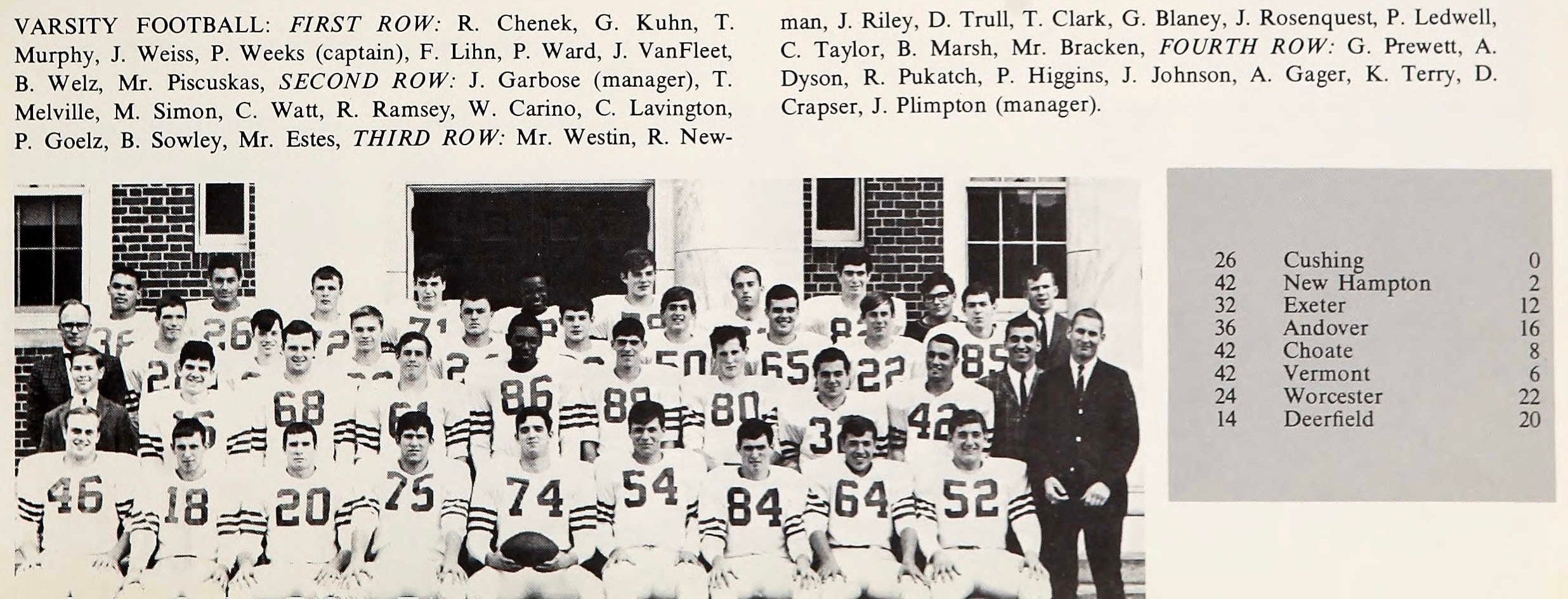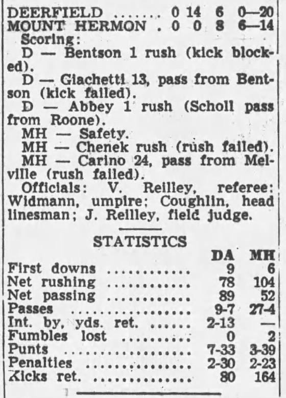 Entering the season-ending 1965 game against Deerfield, Mount Hermon had last lost a football game in 1963, winning 17 straight, including seven that season. Played annually since 1942, Mount Hermon led the series with Deerfield 11-10-2 and sought to win its fourth straight rivalry game.