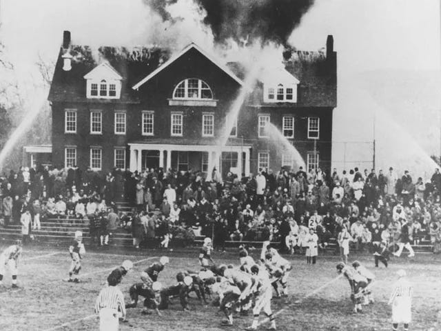 A now-famous image of the event shows fans in the stands watching the game rather than the fire, suggesting they cared more about the game than the blaze —but that was only partially true. The playing field was approximately 100 yards from Silliman Hall and nearly twice as distant from the home stands and press box on the west side of the field. The east side usually stood empty, but for each year’s rivalry game, Deerfield and Mount Hermon lent one another bleachers to accommodate the crowds that reached 6,000 in some years. Hence, the fans seen in the images are largely Deerfield fans, who cared less about the building than the Mount Hermonites did, especially since Deerfield held the lead throughout the conflagration.