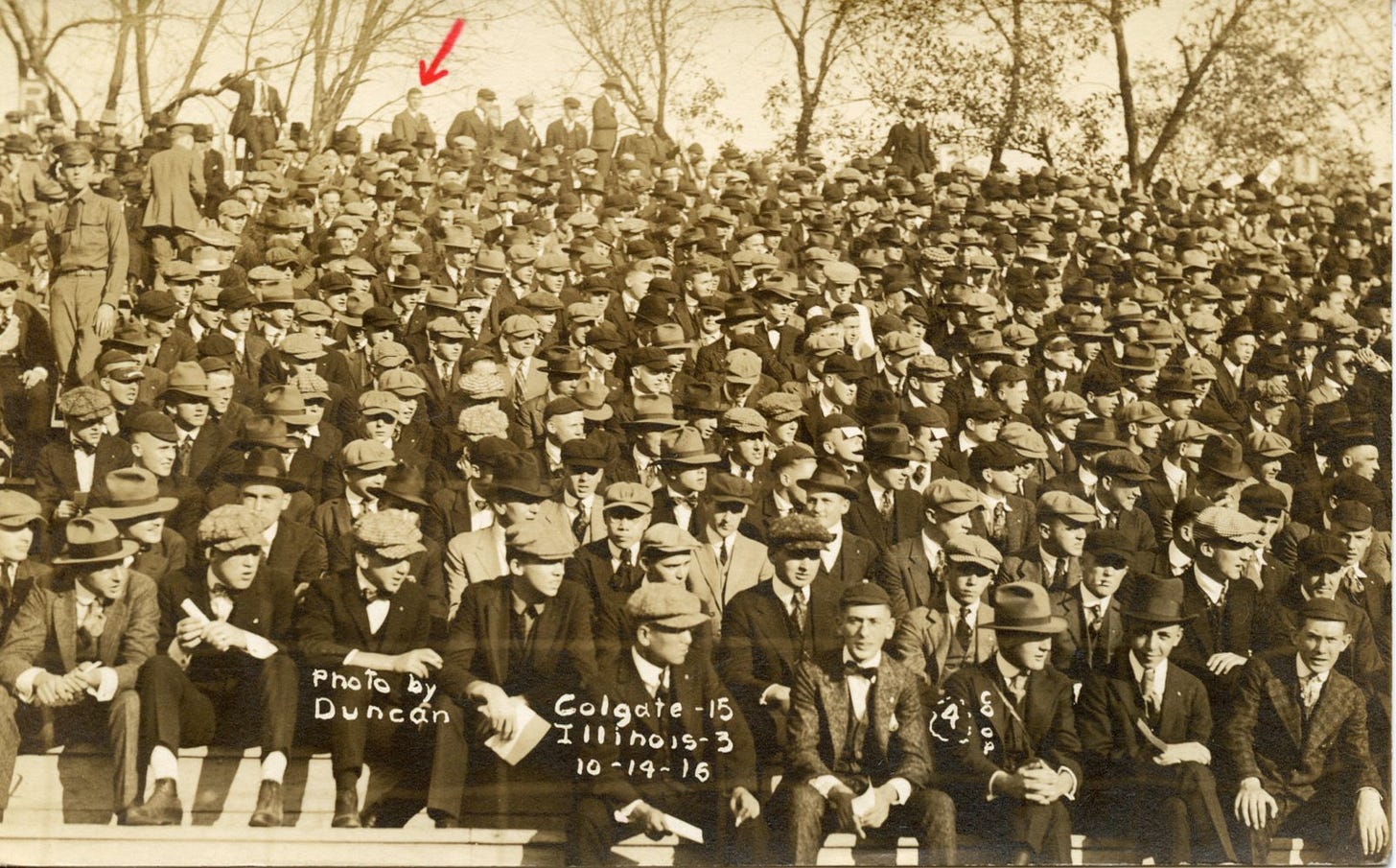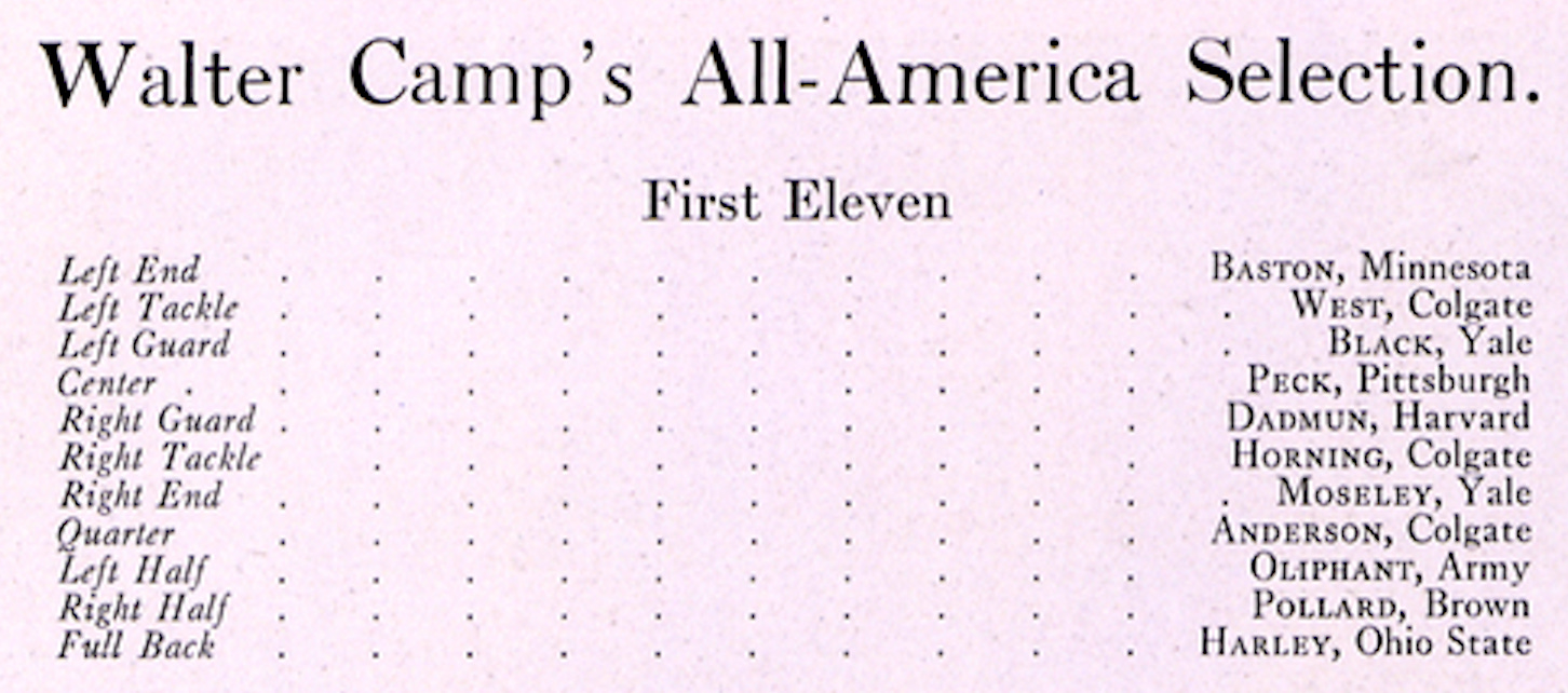 Despite the forecast, the Illini struggled to weather the Eastern storm. While Zuppke expected his line to compete with Colgate’s, the Raider line, led by tackles Belford West and Clarence Hornung, paved the way for Gillo, a 200-pounder from Milwaukee, who consistently ran through openings in the forward wall. Colgate’s Belford West placekicked a field goal in the first quarter, and a series of forward passed by Ockie Anderson led to a rushing touchdown by Spencer in the second. Illini’s Macomber answered with a field goal in the third quarter before Colgate’s Anderson again started throwing the pea in the fourth, including a touchdown pass to Hubbell, and a 15-3 victory.