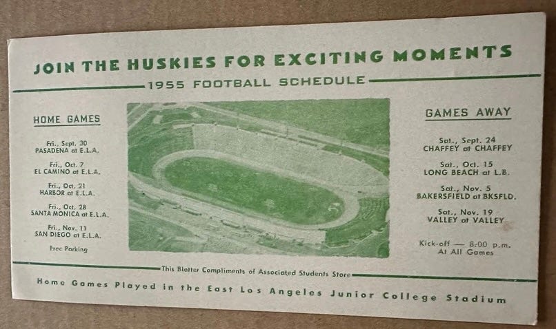 I didn't know any of that before spotting the 1955 East LA football schedule below, which was printed on an ink blotter and served as a campus giveaway. But the stadium seemed rather sophisticated for a community college. It caught my eye, so I looked into it.