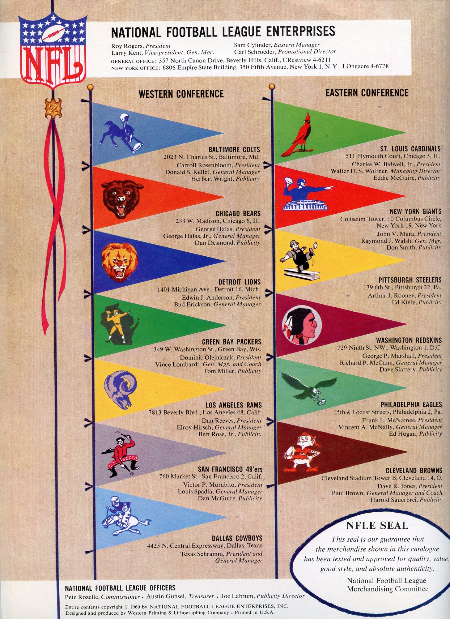 Among the steps they took was to centralize television contracts and merchandising functions with the league rather than the franchises, leading to the creation in 1959 of NFL Enterprises as their licensing arm. Now, if you were the NFL in 1960 and needed someone with significant experience licensing their name, image, and likeness, who would you choose as your partner? In 1960, that person was the recording, radio, movie, cartoon, and television star, the King of the Cowboys, Roy Rogers, and his organization, Roy Rogers Frontiers, Inc. Rogers and company had a decade or more experience and already worked with 45 manufacturers, selling 400 licensed products emblazoned with his NIL, and while the companies looking to license Roy Rogers' image might not be identical to those of the NFL, there was plenty of overlap.