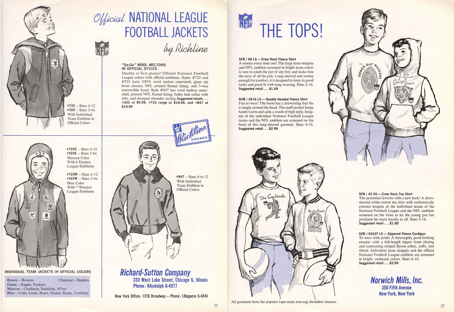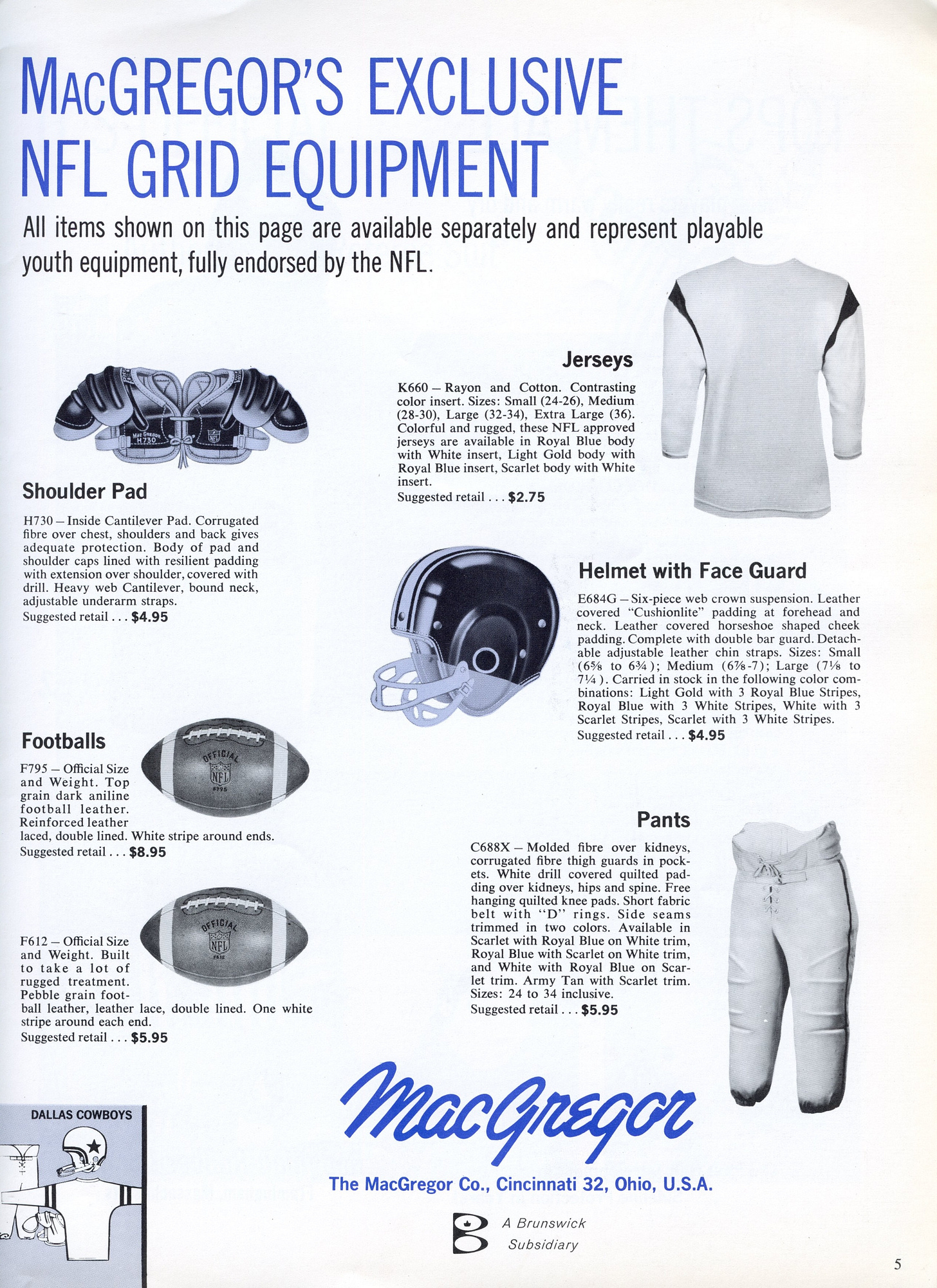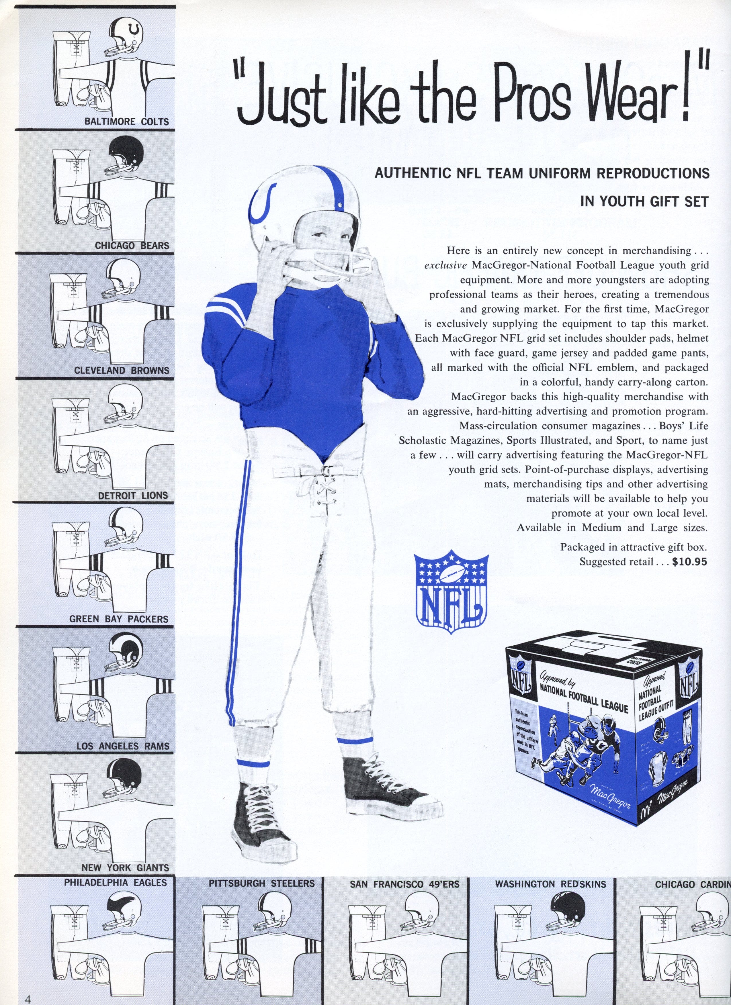 If your boy was a real man in 1960, the only outfit he needed was one that minimally resembled the gear worn on Sundays, but they advertised it as "Just Like The Pros Wear." MacGregor was the partner on this one.
