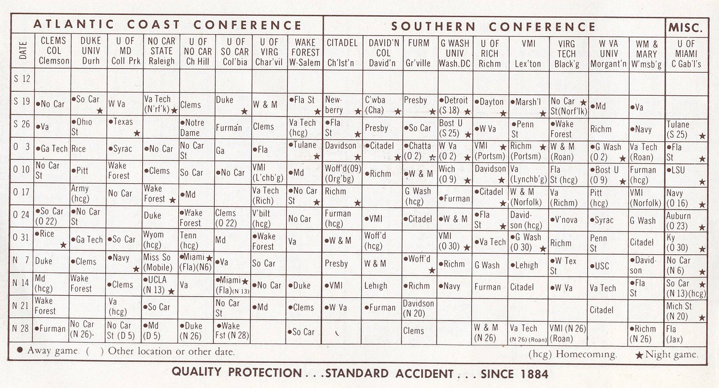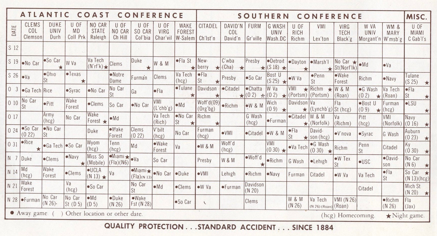 Six of the eight ACC teams remain in the conference today; South Carolina became an independent in 1970 before joining the SEC in 1992. Meanwhile, Maryland opted for the Big Ten, and Miami, listed as Miscellaneous, is now in the ACC.