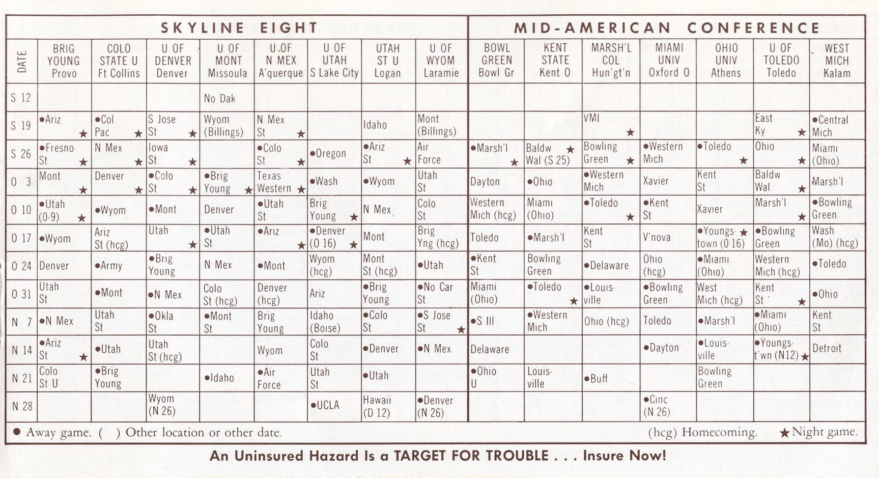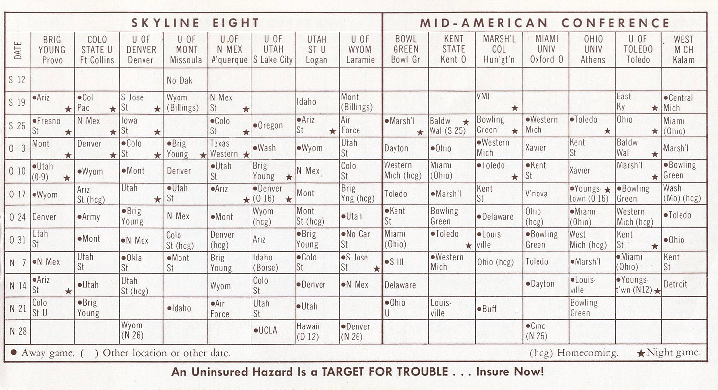 Half the Skyline Eight now calls the Mountain West home. Utah eventually skipped off to the Pac-12, and BYU is independent. Montana became a founding member of the FCS Big Sky in 1963, while Denver dropped football after the 1960 season.