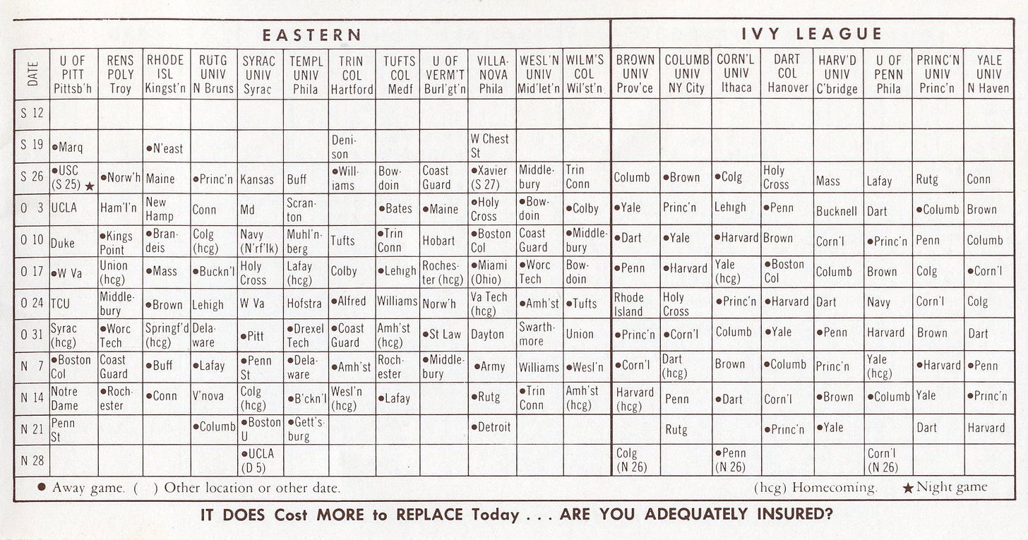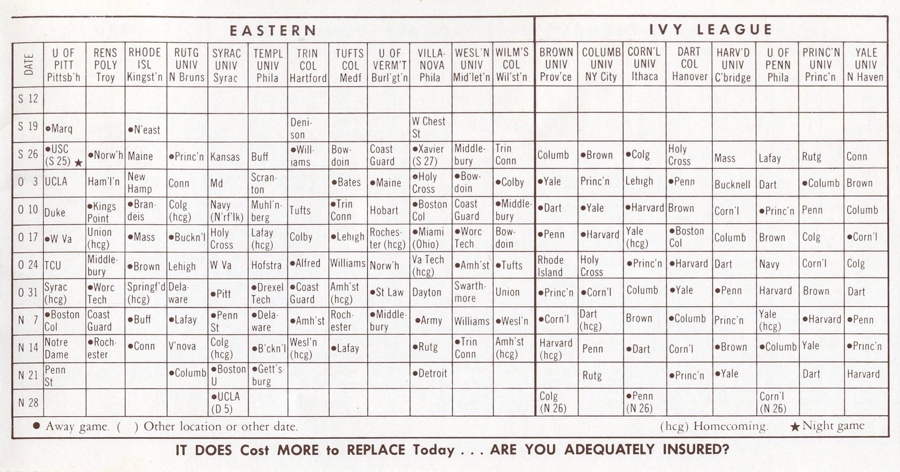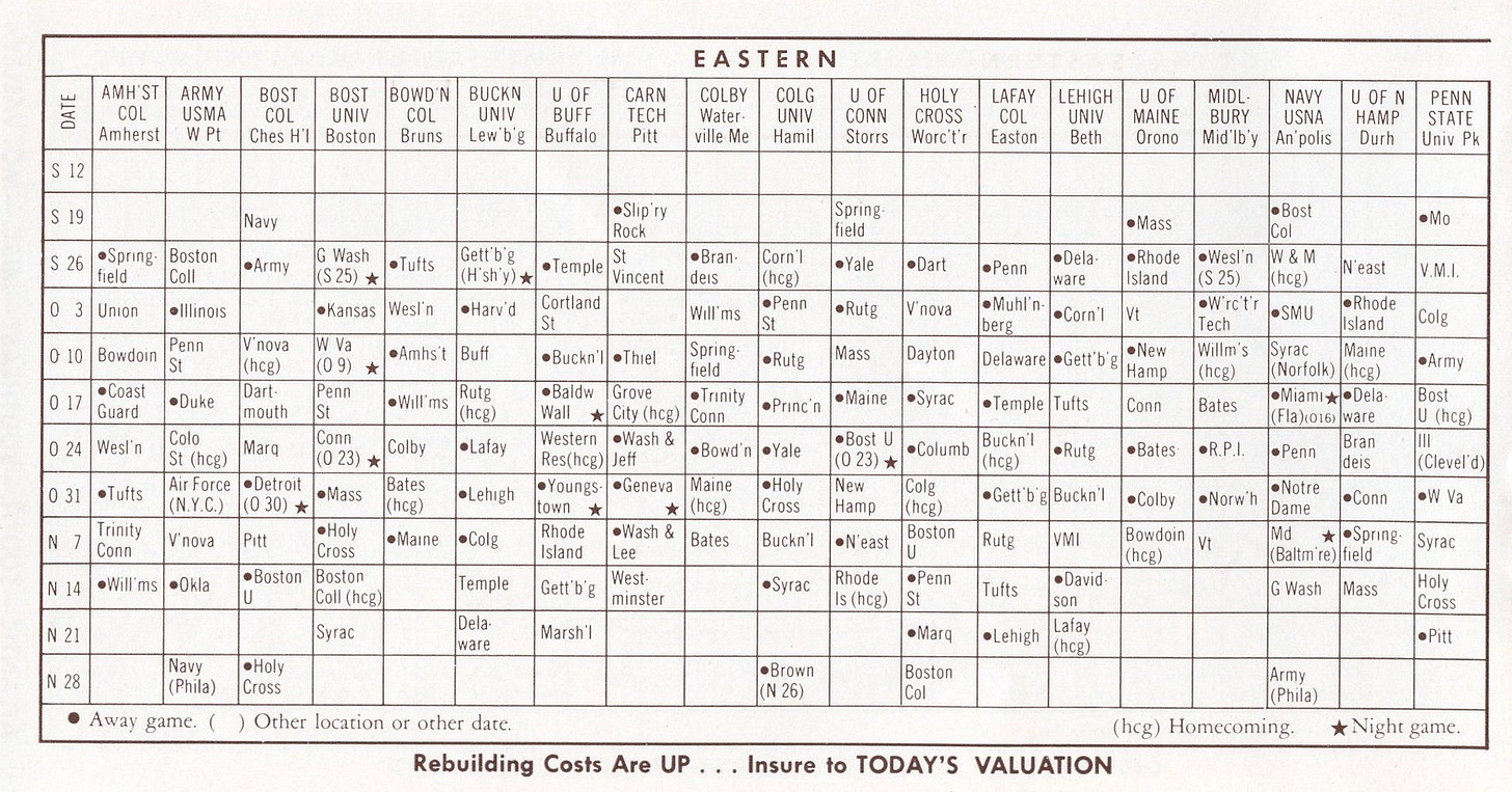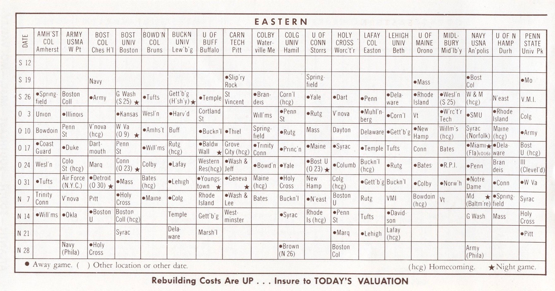 While there were many Eastern Independents in 1959, they have since scattered to the wind. Army and UConn are the only current Independents, and both joined and then dropped out of leagues since then. The ACC picked up three teams and the Big Ten two. Three others play in Group of 5 conferences, nine teams play FCS in the Colonial and Patriot, ten play DIII, and two have dropped football.