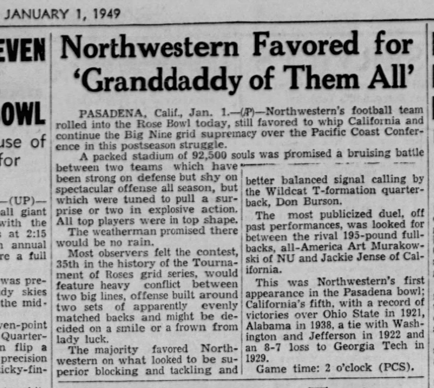 A key moment, however, came on January 1, 1949, as the 35th Rose Bowl loomed. It was the first Rose Bowl played by Northwestern, leading a Louisiana newspaper to headline its preview of the Rose Bowl, as shown below.