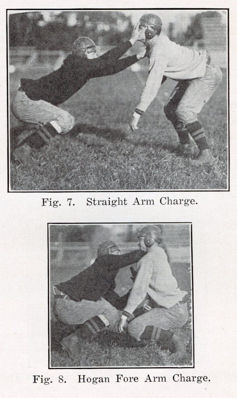 The first two are the Straight Arm Charge and the Hogan Fore Arm Charge. The straight arm charge is similar to today’s bull rush, except Graves tells us to charge with both hands, aiming for the opponent’s face or their shoulders. The first image below shows one hand in the face and the other on the shoulder.