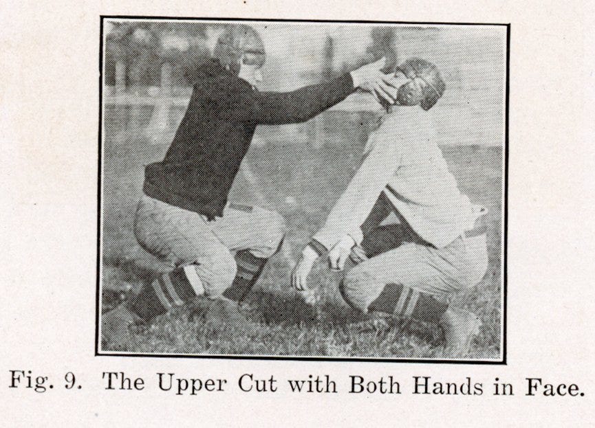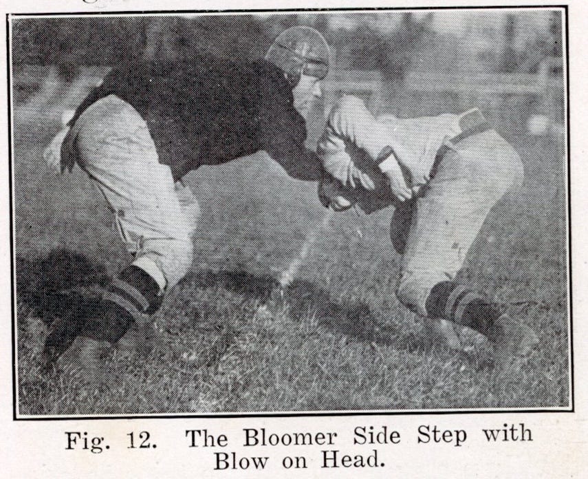 Long before Deacon Jones made the Head Slap famous, James Bloomer of Yale introduced the Bloomer Side Step with Blow to the Head. Graves’ instructions for the move are to “Deliver a blow to the side of the head with either hand, knock the opponent to one side, and go through.”