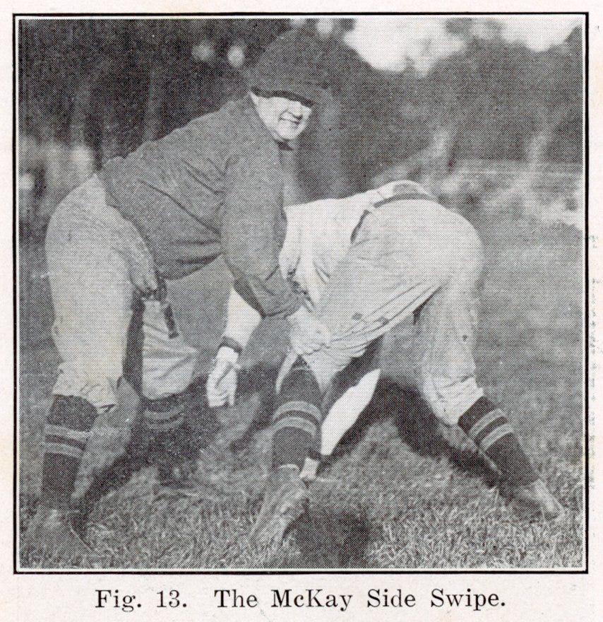 The McKay Side Swipe is another favorite. Named for Harvard’s Robert McKay, the Side Swipe involved grabbing a charging opponent by the neck and knee before pushing them aside.