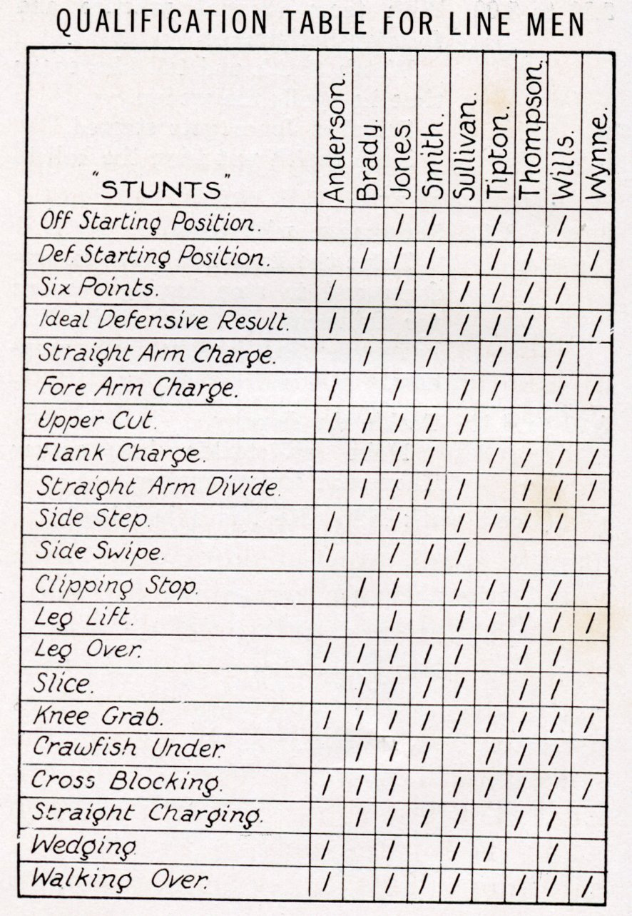 Graves offers another five or six stunts that players should have in their toolkits, and found it valuable to keep an inventory of which players were proficient in these and other skills. He included the example form in his book.