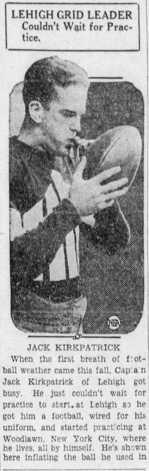Kirkpatrick was Lehigh’s captain. However, he played tackle, so that may explain why he was unfamiliar with the advances in footballs that occurred during his time in Bethlehem.