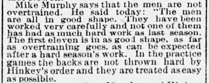 A recent discovery shows that the desire for limited contact in practice goes back at least to 1893, when one of the meanest and nastiest players around captained the Yale Bulldogs. Frank Hinkey, who played end and captained the team, made it known that the running backs were to be treated with kid’s gloves under his watch.