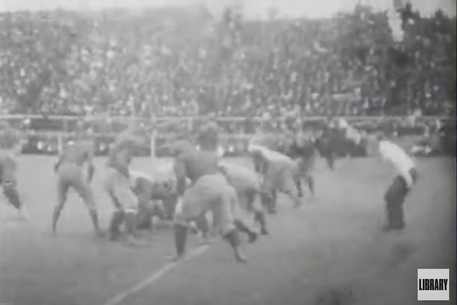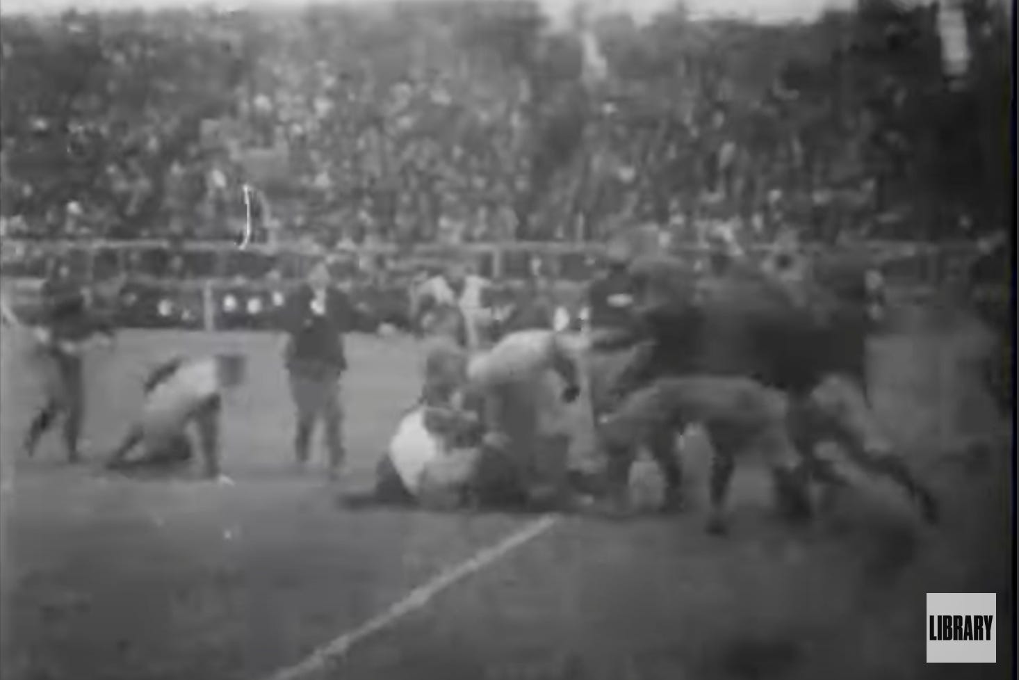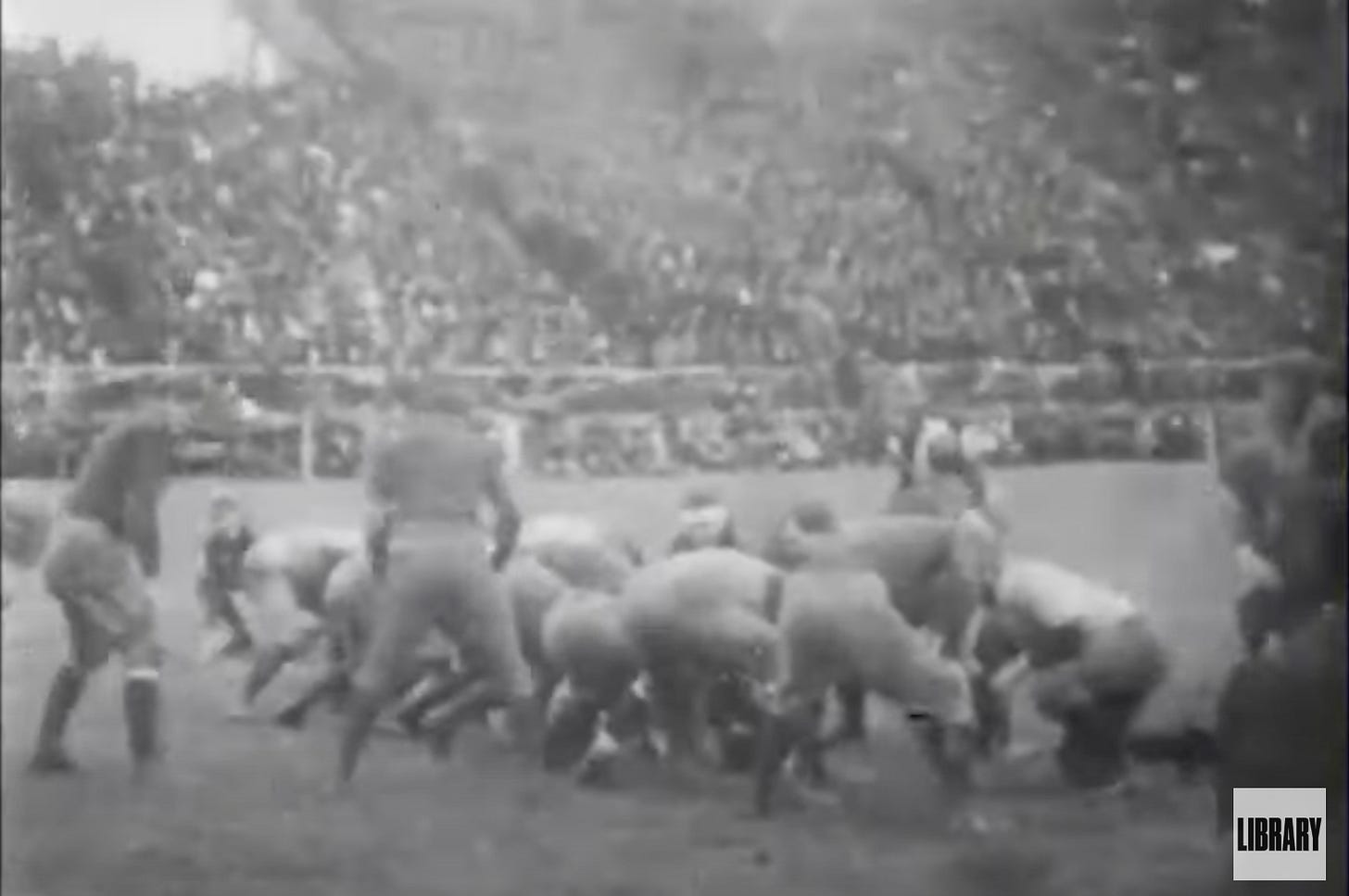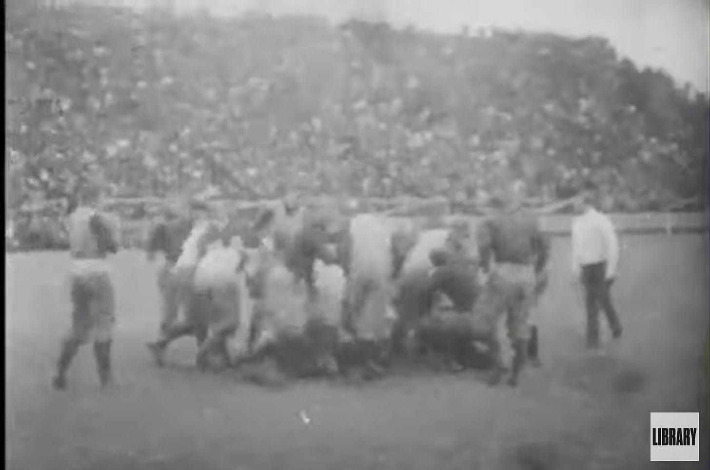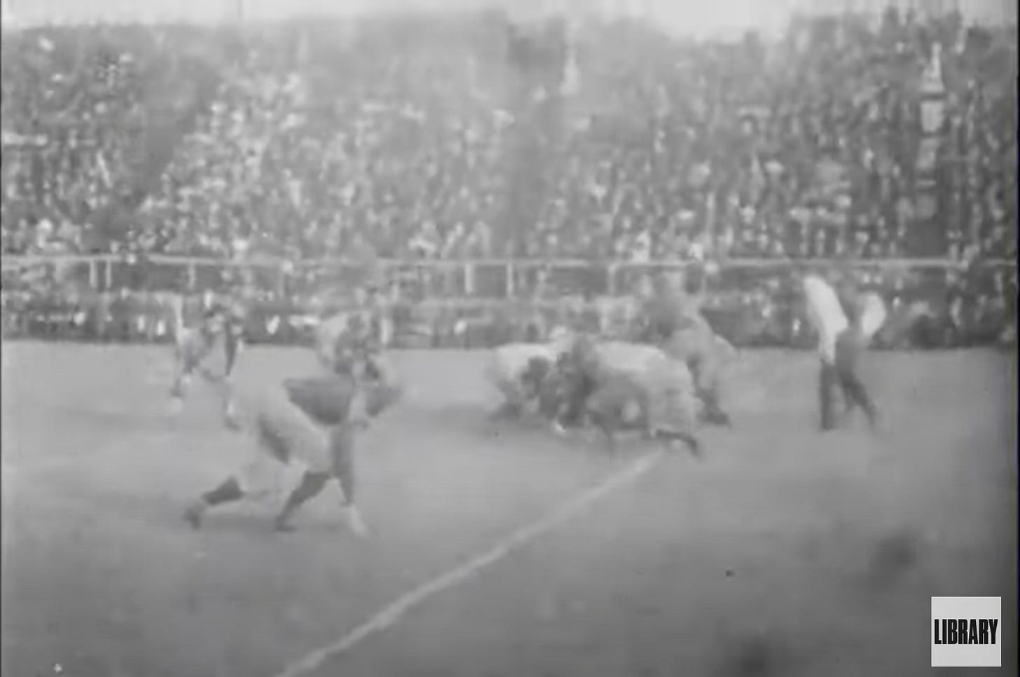 The scene starts with a run up the middle. The film picks up partway through another play, during which the defense gains possession of the ball in the offensive backfield and runs toward the goal line. This was likely a third-quarter Princeton fumble which Yale advanced for 20 yards.