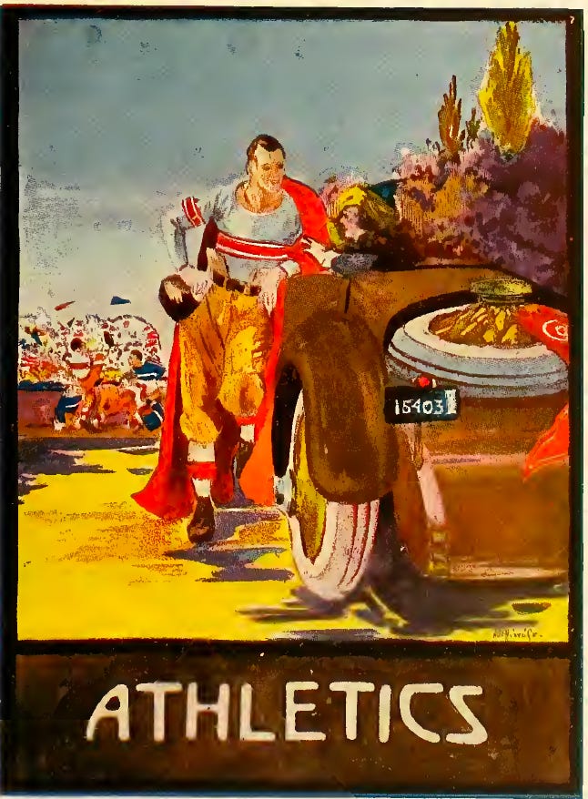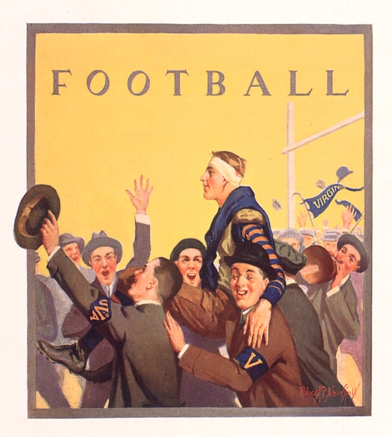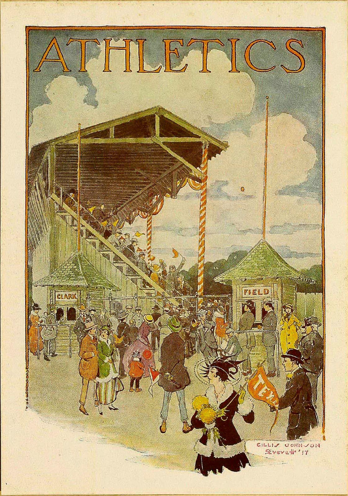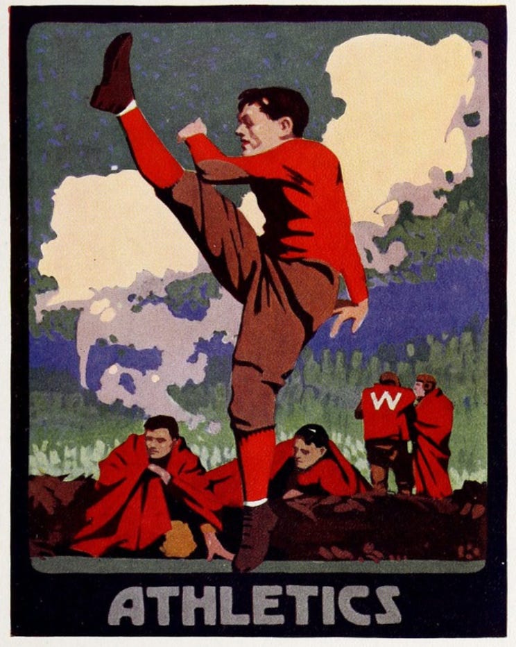 Few college yearbooks of the late 1800s and early 1900s included color images. Over the next several decades, yearbooks increasingly used color illustrations on section title pages for the athletics section or individual sports such as football. Part of the attraction of these illustrations is that the students created them who were peers of the athletes playing in the games. Most illustrations were as run-of-the-mill as the teams they represented, while others were exceptional, standing out in the otherwise black-and-white yearbooks.