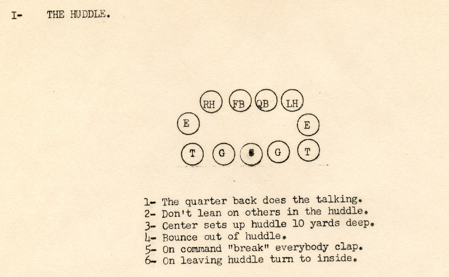 From the beginning, Zuppke uses a closed huddle with the team forming a ring around their kneeling quarterback five yards behind the line of scrimmage. Others, like Jimmy Phelan's 1939 Pitt squad, formed a rectangle rather than a circle, but both accomplished the same objectives. A Zuppke saw it, huddles: