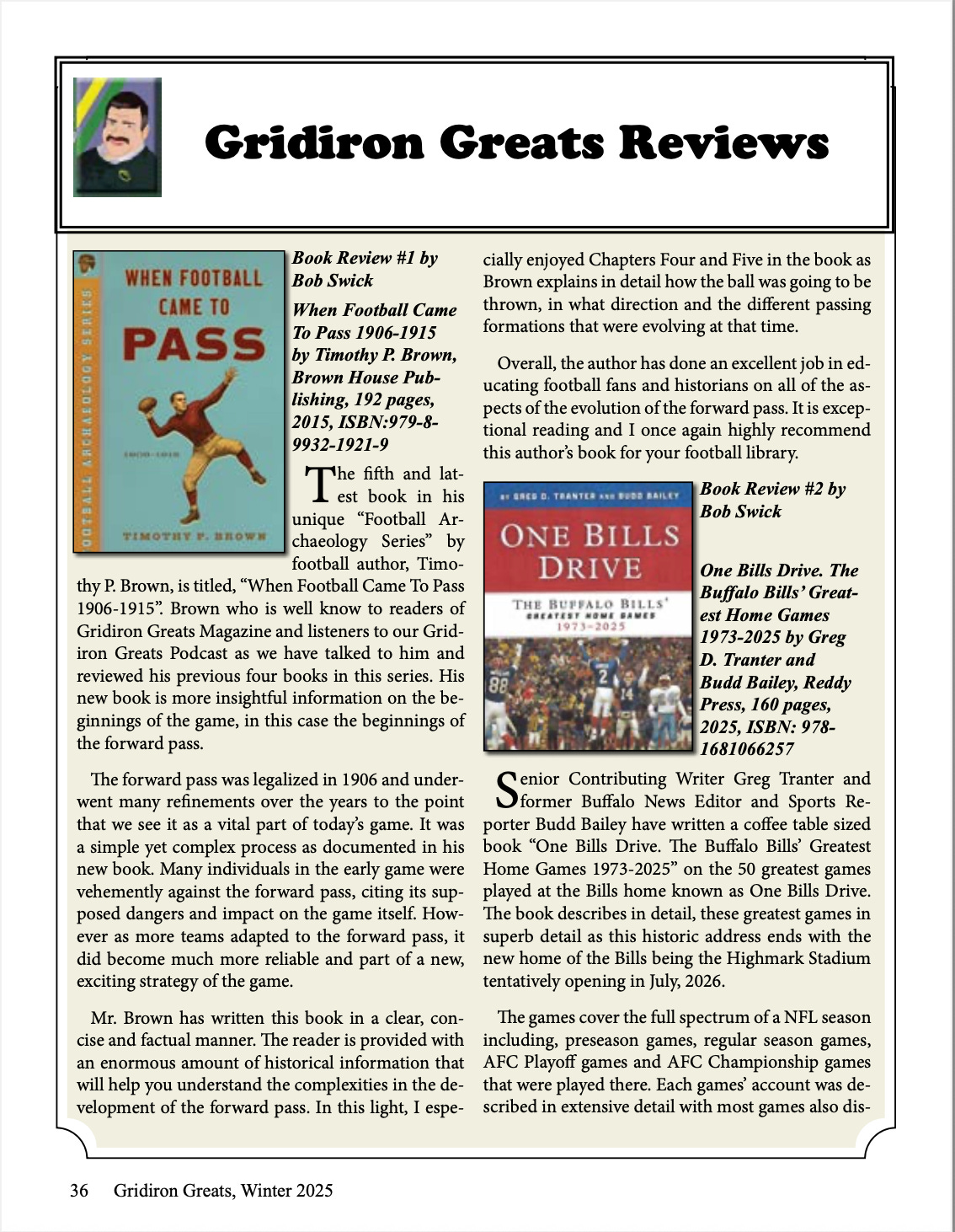 Bob Swick, the publisher of Gridiron Greats magazine, reviewed When Football Came to Pass in the Winter 2025 issue (Vol. 24, #91), saying: