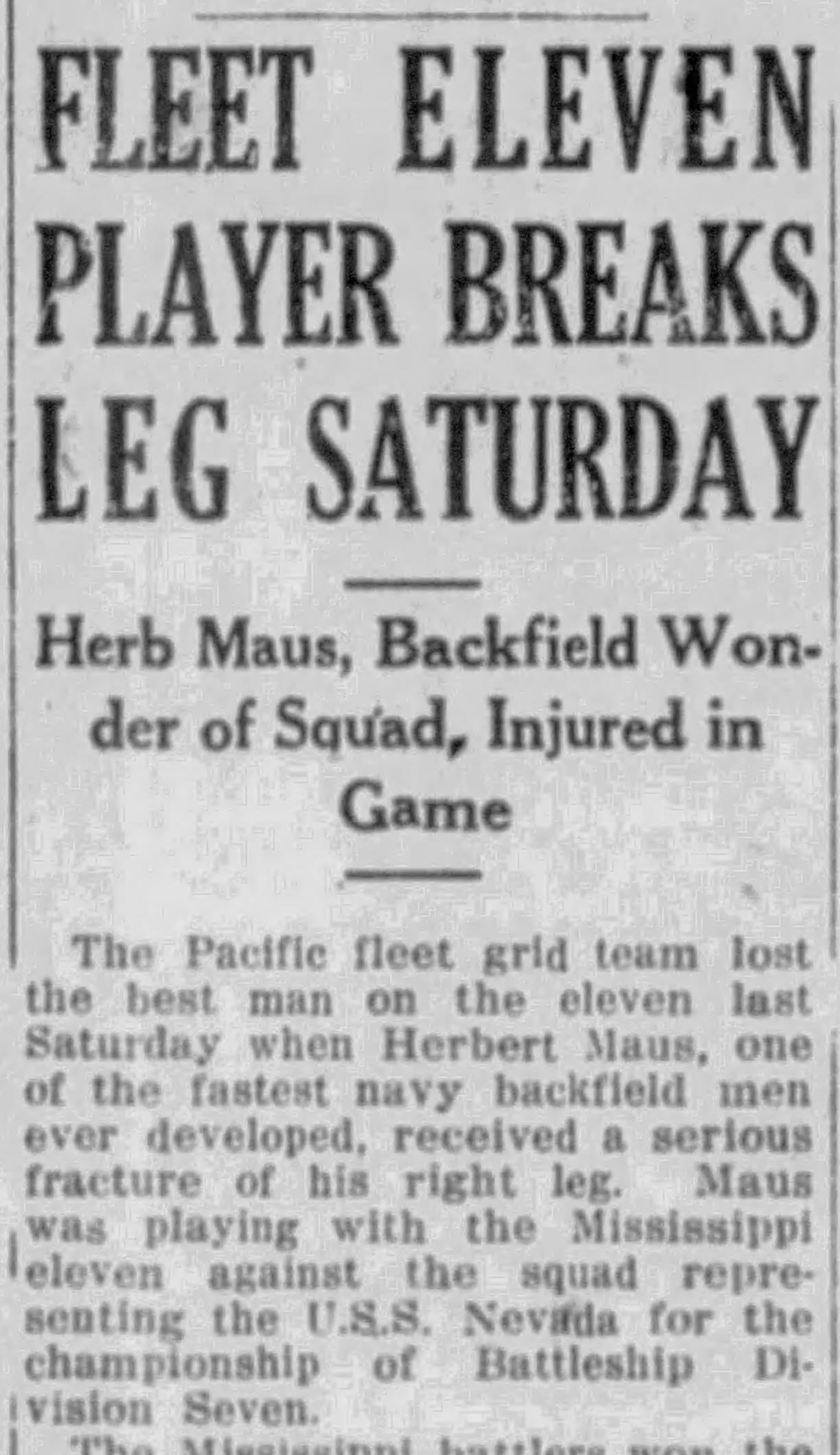 The weekend before the Army game, Maus played for the U.S.S. Mississippi in their division championship game against the U.S.S. Nevada. While Maus played on the offensive line for the fleet team, he was the star running back on his ship's team and scored a first-half touchdown to help win the championship game. Unfortunately, Maus suffered a severe leg break while carrying the ball around the end in the third quarter. The medical staff used a fence post and bandages to stabilize his leg before taking him to the hospital for surgery. Maus remained on the hospital ship for weeks while recuperating.