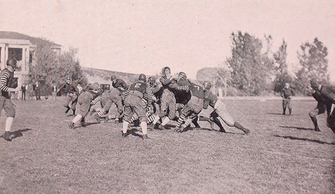 Next up was Andy Smith and one of his Cal Wonder teams. Cal had several players nursing injuries, but Pacific Fleet had the same issue, dressing only 12 players and losing 27-10. Still, Smith told reporters after the game that the Pacific Fleet team was on par or better than the top college teams on the coast. The 1921 season proved him out. Cal outscored their opponents 312-33 and went 9-0-1, tying Washington & Jefferson 0-0 in the 1922 Rose Bowl. Pacific Fleet was the only team to lead Cal in a game or to score double digits against them, and Cal's margin of victory over Pacific Fleet was the narrowest among the nine teams they defeated. So, the Pacific Fleet team was a damn solid outfit.
