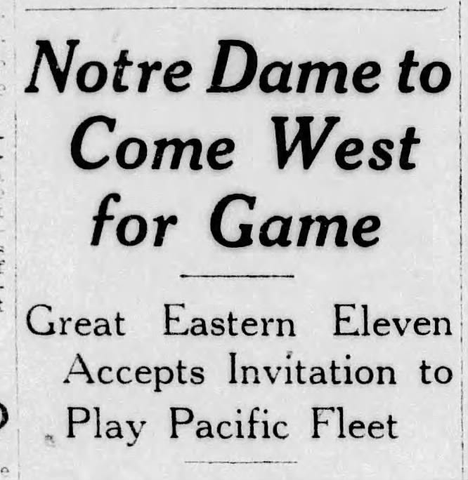 The 1920 Pacific Fleet team included five or six young ensigns who had starred at the Naval Academy, including two first-team All-Americans. Bill Ingram was their star fullback and captain, who later coached Indiana, Navy, and Cal. Several West Coast colleges refused to play the fleet team after they pounded U.S.C. in a scrimmage, but their reputation led to them being touted for postseason play. Regular readers may recall that the 1918 and 1919 Rose Bowls featured military teams, and as San Diego and San Francisco looked to follow Pasadena's lead by sponsoring postseason games, Pacific Fleet was targeted to play Centre College or Notre Dame somewhere in California.
