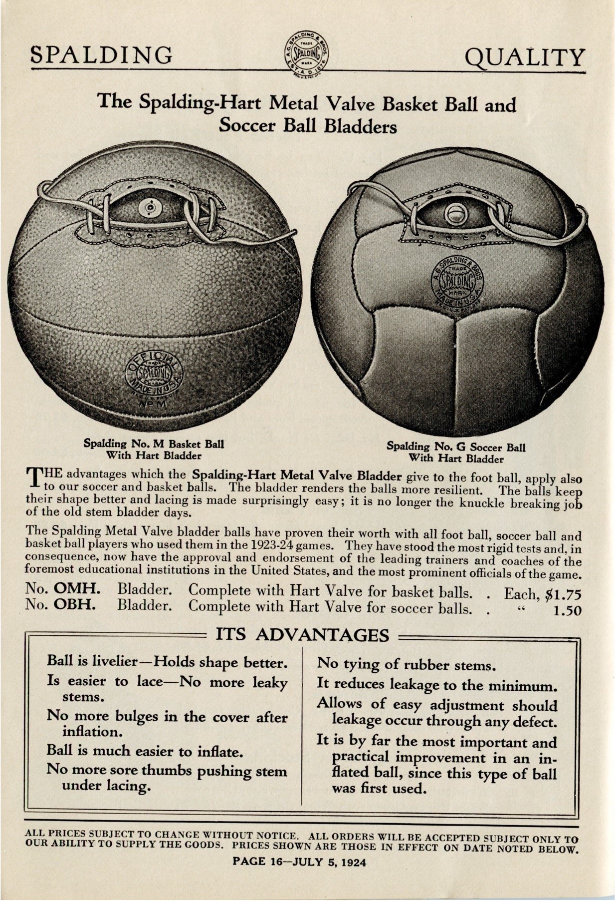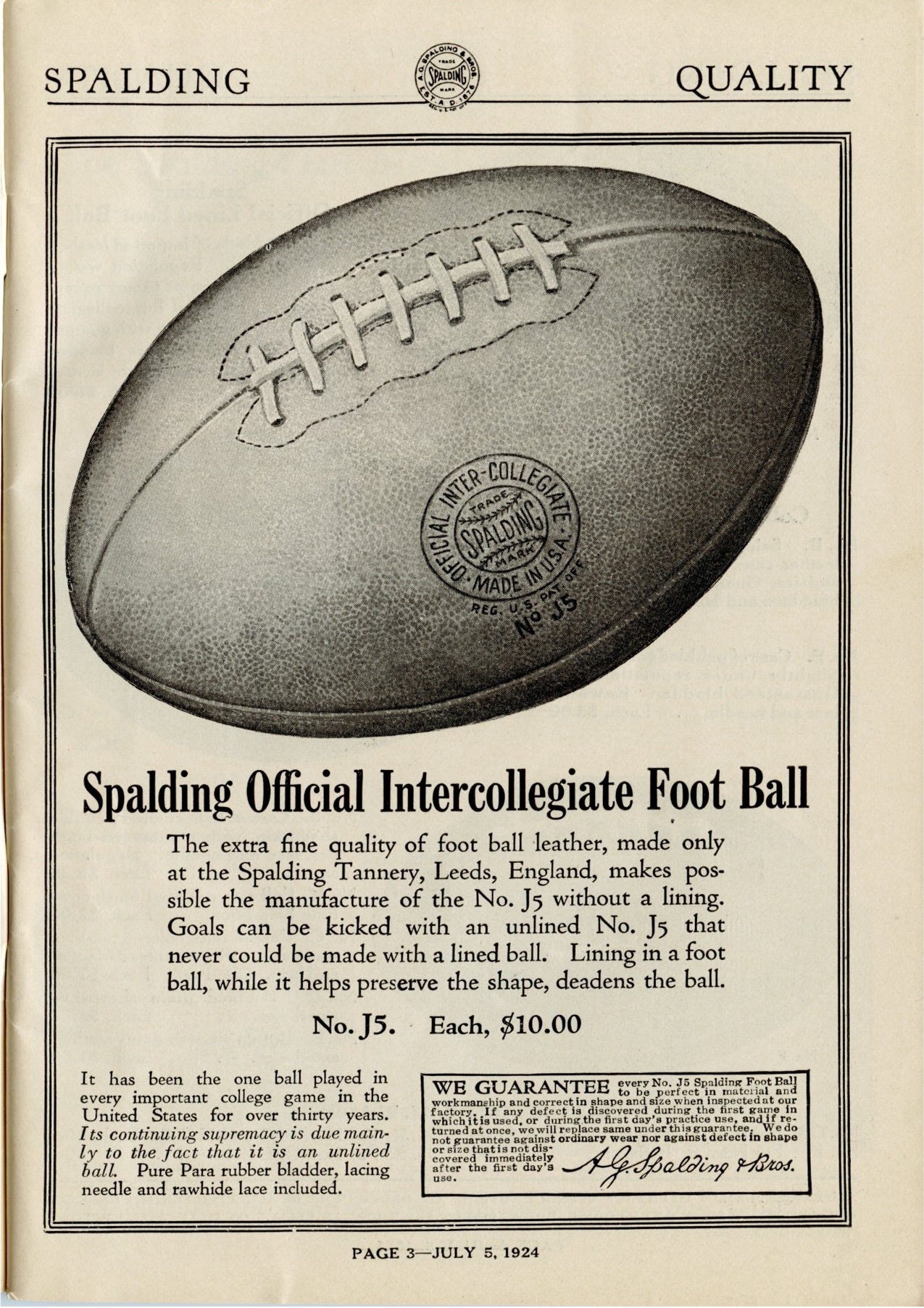Despite All-Americans carrying the J5, Spalding made them of English leather. More important, as the note in the bottom left corner of the following page informed potential buyers, Spalding boxed and shipped the balls unlaced, accompanied by a length of rawhide and a lacing needle. Customers laced them before their first use.