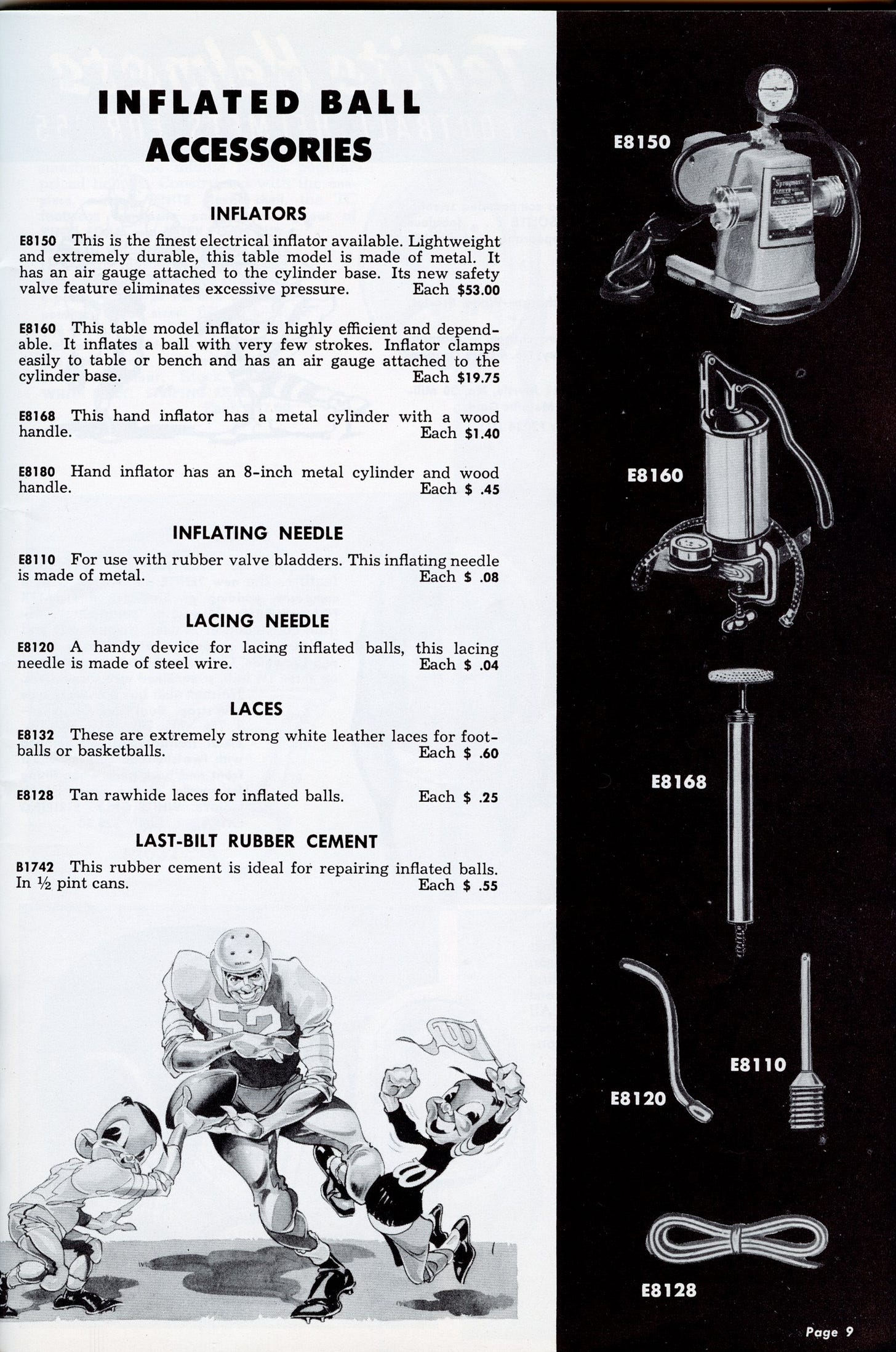 However, mainstream sporting goods manufacturers do not appear to have used inflating needles on leather balls for another decade or more, with the first reference I found coming in a 1952 Reach of Canada catalog, while Wilson showed our favorite needle in their 1955-56 catalog.
