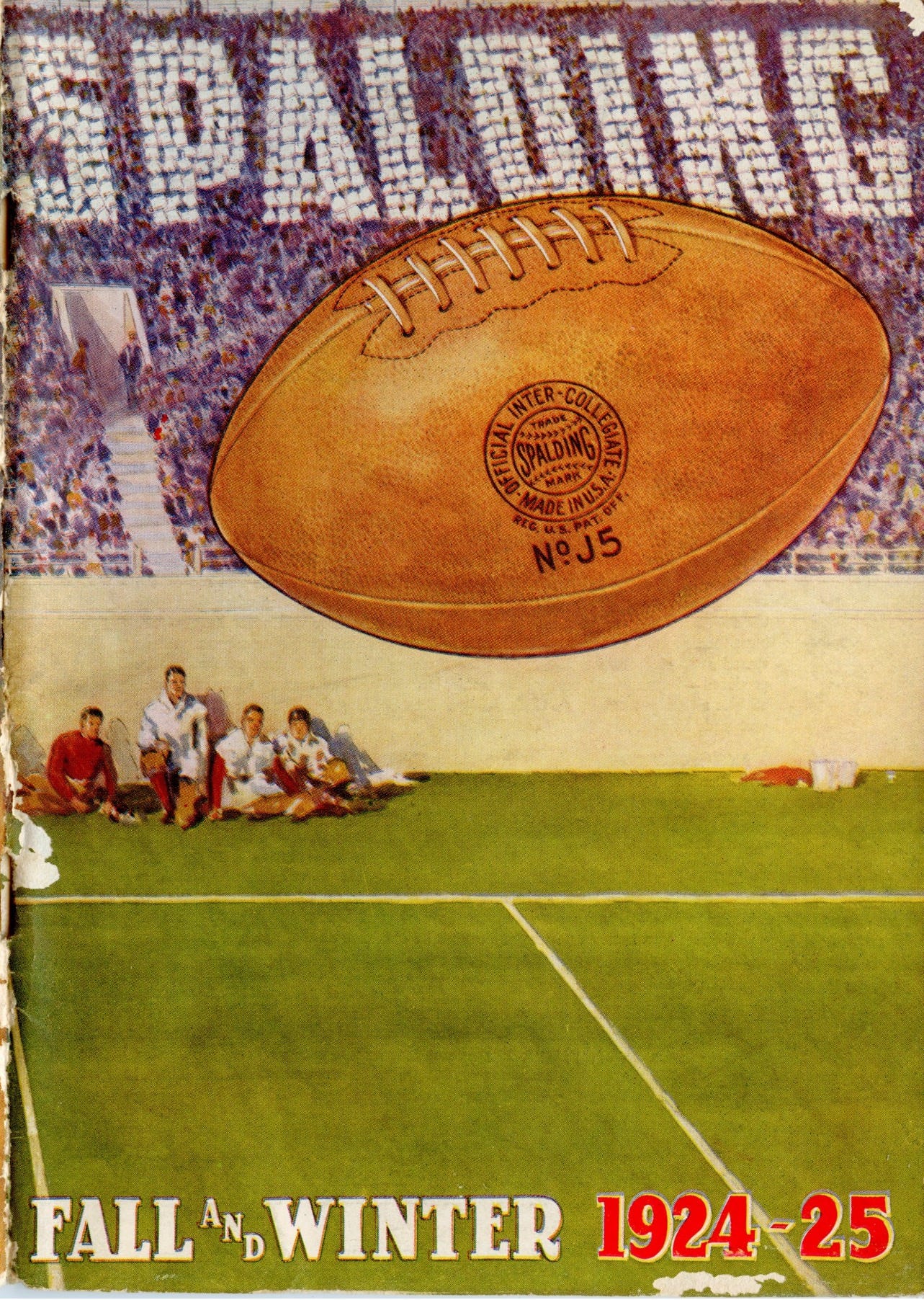 These and other issues are covered in A History of the Football, which traces the evolution of the football’s materials, construction, and appearance from its rugby origins to the ball we use today. Having written that book, I suspect I have investigated the ball’s historical trajectory as thoroughly as anyone. Yet, I learned something new last week when I acquired the 1924-25 Spalding Fall and Winter catalog, which has the beautiful Spalding J5 on the cover.