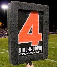 Back in the day, the linesman ran around the field carrying a down box attached to a long stick. Prior to each play, he spun the down box, so the appropriate number faced the players on the field. The box on a stick is a forerunner of the down boxes used today.