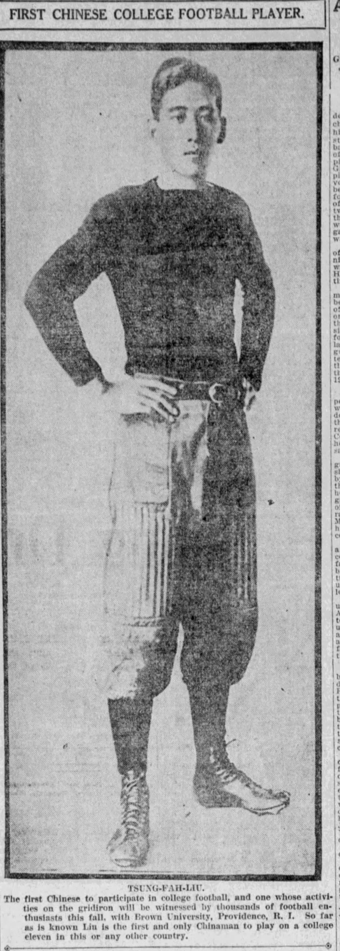 The same year, Tsung Fau Liu appeared at Brown, after playing football at a California high school and at Exeter. Like others before and after him, they called him the “first” of his ethnicity to play football, though we must forgive their sins, since the internet was still in its early stages then.