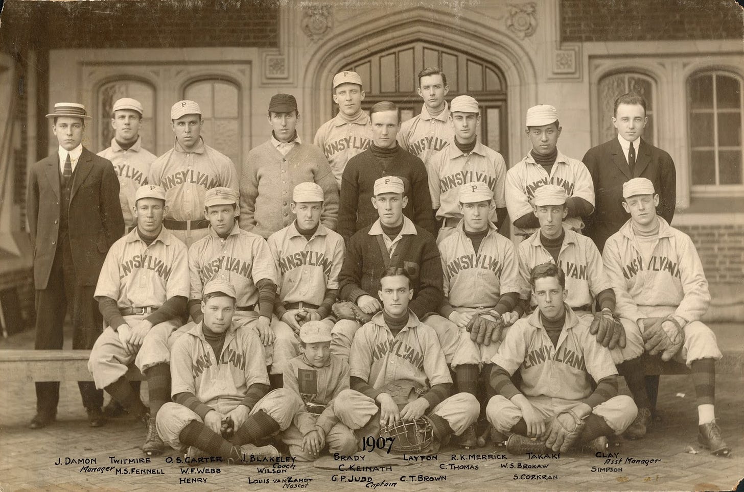 The following year, there were reports of Ting Chai Chen playing for West Point and Shunzo Takaki for Penn. Although information on the West Point player proved elusive, Takaki received significant coverage for excelling on the tennis court and baseball diamond, and to a lesser extent, the football field. A native of Tokyo, Takaki saw action at left end during the 1906 season and expected more in 1907 before being diagnosed with an enlarged heart, which seems to have ended his playing career. He was Penn’s starting second baseman as well, and is considered the first Asian player in college baseball.