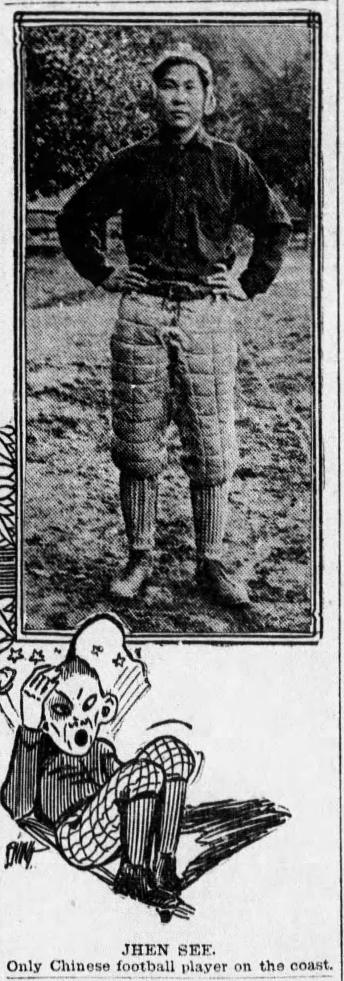 Based on what I found, there were a handful of White Hawaiians on college teams in the 1890s, and several Asian American high schoolers on the West Coast in the first years of the new century, but the first college player of Asian descent appears to have been Jhen See of Pomona College. Like some others, it isn’t easy to determine whether See was a Chinese citizen or a Chinese American, since newspaper coverage often treated them as the same.