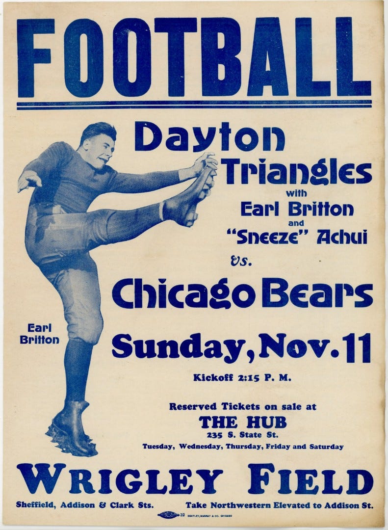 One, Earl Britton, gained fame as Red Grange’s fullback at Illinois, so focusing on him made sense for a game in Chicago. The second player, “Sneeze” Achui (actually Achiu), played at the University of Dayton and was distinctive primarily for having a Chinese father and a Native Hawaiian mother, making Achiu the NFL’s first player of Asian and Pacific Island descent.