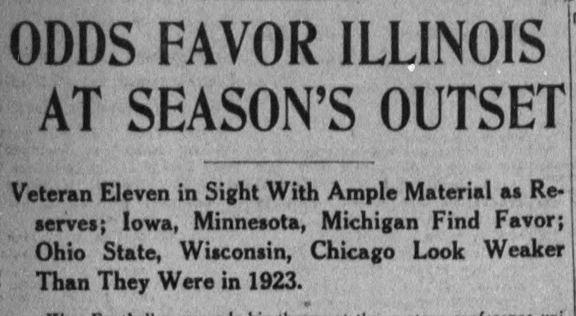 Some favored Illinois to take the Western Conference crown, what with Red Grange toting the rock. Minnesota, Michigan, and Iowa were contenders, while Chicago, Wisconsin, and Ohio State were candidates to be up or down, depending on how things worked out.
