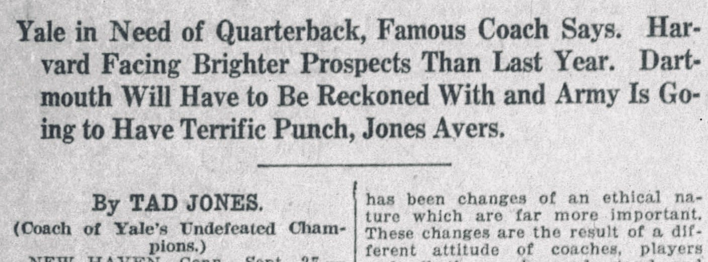 Yale's Tad Jones was like many coaches who wrote articles predicting the season's outlook. He cited graduation losses at Harvard, Yale, and Princeton and pointed to some newer coaches that might have an impact. He expected Cornell's first-year coach Gil Dobie to succeed after his long run at Washington, while second-year mentors Jess Hawley at Dartmouth and Percy Haughton at Columbia might surprise a few pundits.