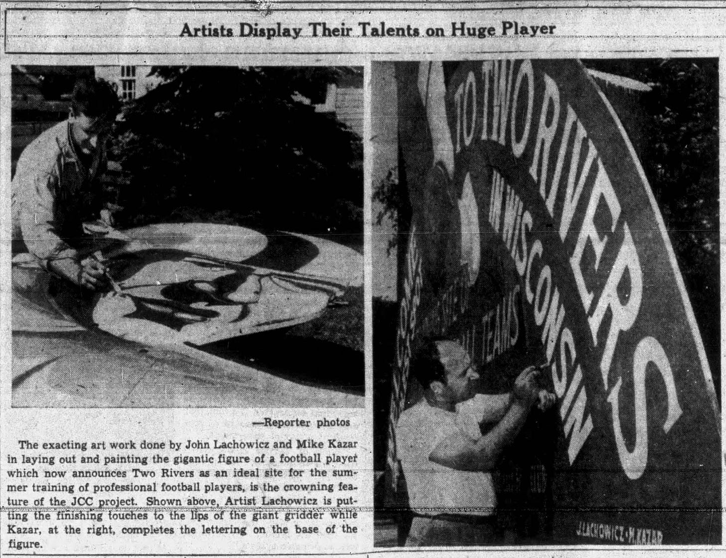 While the sign made the unverified claim that the monster was the world’s largest football player, he stood 35 feet tall, had a 22-foot-long arm, and a 5-foot hand, so he was a pretty big boy. John Lachowicz, a city employee, managed the monster’s design and construction, ably assisted by his vacationing cousin, Mike Kazar, an art teacher at Milwaukee’s Pulaski High.