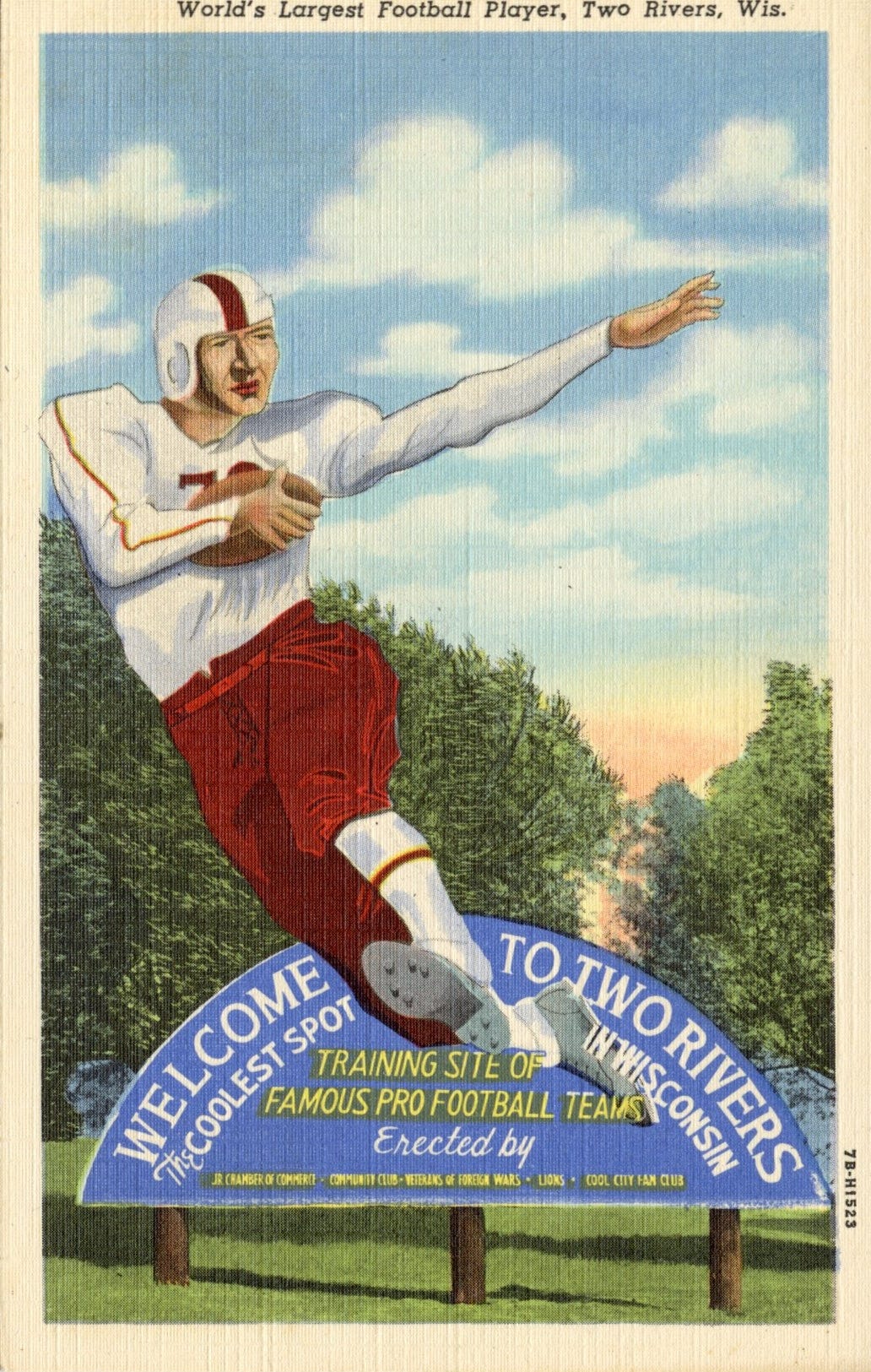 Someone also got the idea of printing linen postcards of the Trivers monster to promote the town and its welcoming attitude toward pro football teams. Luckily, one of those postcards arrived in my mailbox today, allowing me to share its full-color glory with you. Ain’t it a beaut?