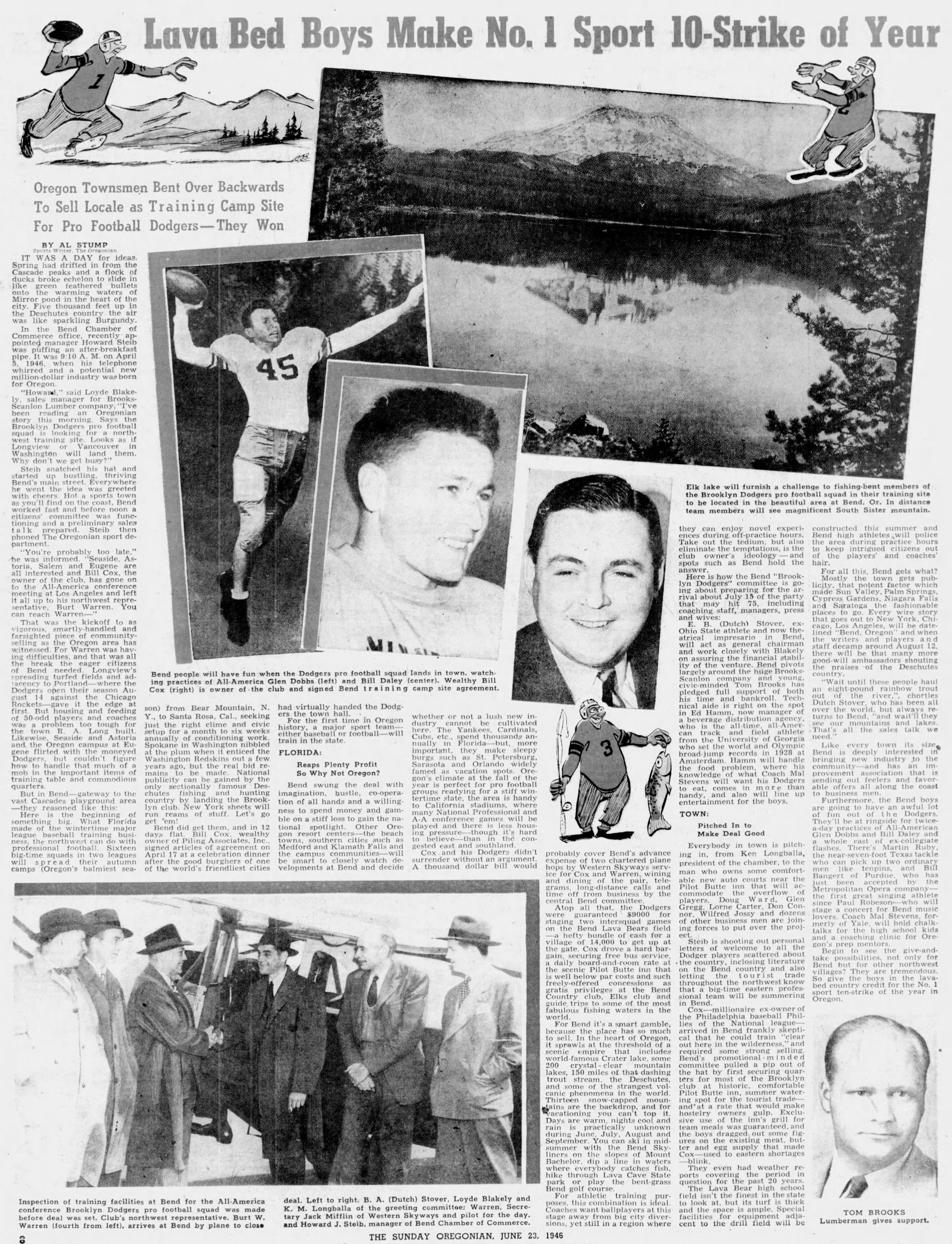 Proving themselves willing to Bend over backward, the town burghers guaranteed $9,000 in gate receipts for two intrasquad games in town, below-market pricing for the team’s stay at the Pilot Butte Inn, access to the local country club, and guided fishing trips. In exchange, Bend mostly received publicity, as newspapers across the country would print Bend, Oregon, in the byline of every story about the Dodgers. Meanwhile, the townsfolk received six weeks of excitement watching professional athletes play on the local high field and stroll about town.