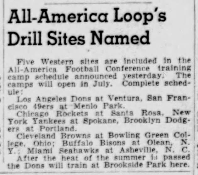 Each AAFC team made their decisions by early May. Press releases announced their camp locations. with five of the eight teams choosing the West Coast, despite only two teams calling the Left Coast home.