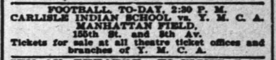 Carlisle stayed at The Ashland and dressed for the game at the YMCA, before tally-hos took both teams to Manhattan Field, a ride that took ninety minutes, but included a tour of Central Park.