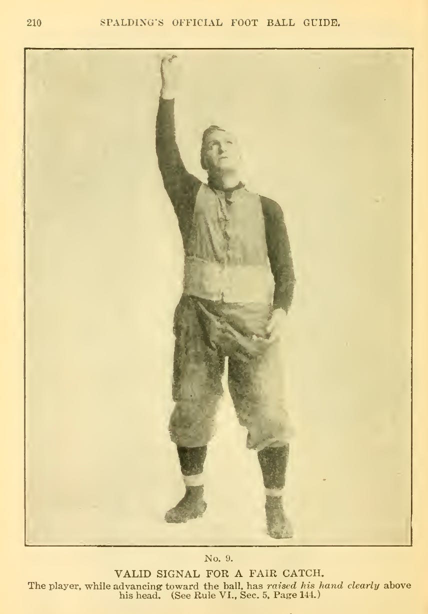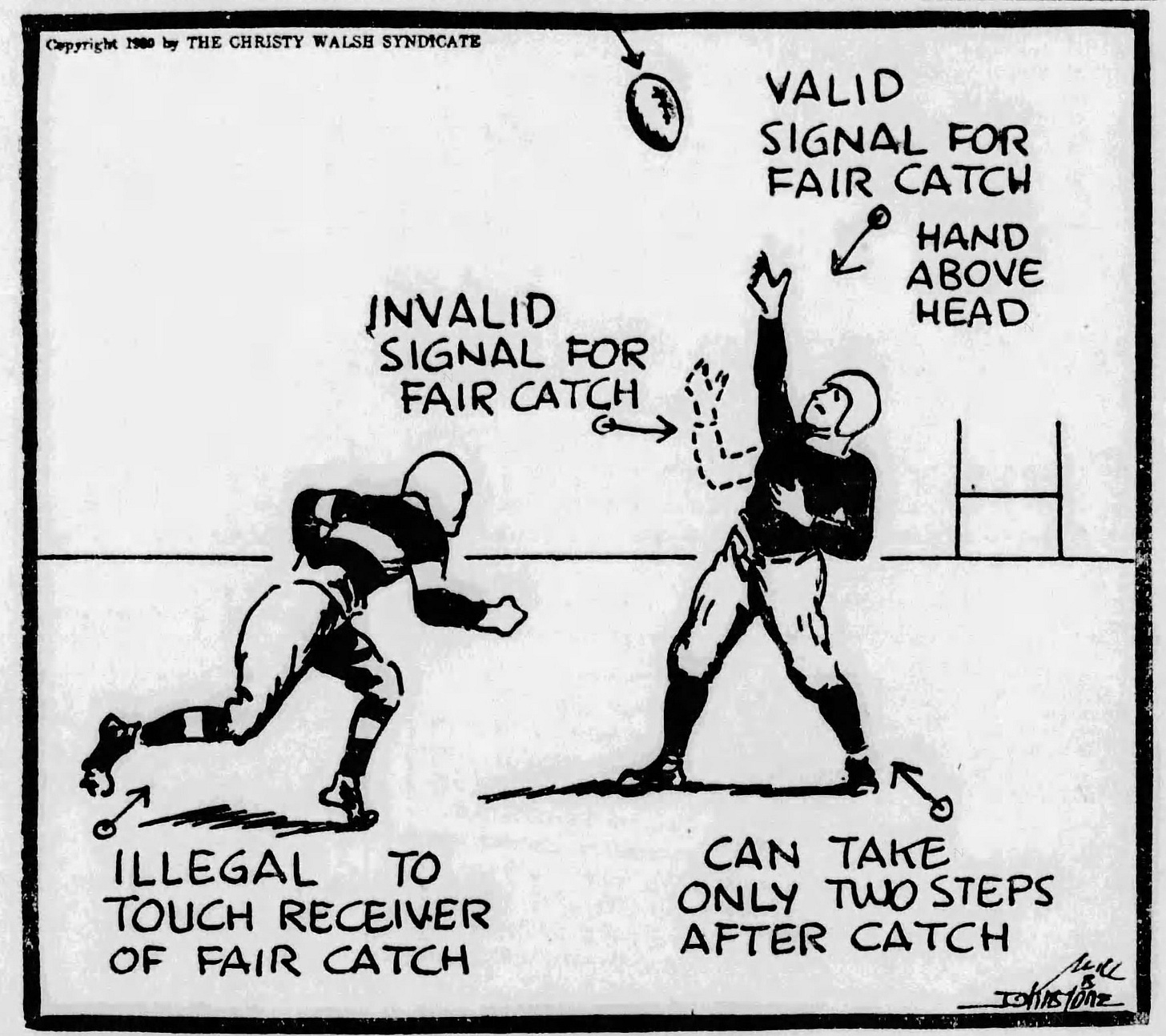 In the early days of football, a player designated that he was making a fair catch by “heeling in;” that is, he dug one of his heels into the ground while making the catch. The late nature of the signal meant that coverage teams often did not wait for the signal and hit the return man, incurring a penalty and potentially hurting the returner. An 1894 rule required the returner to raise one arm in the air to signal a fair catch.