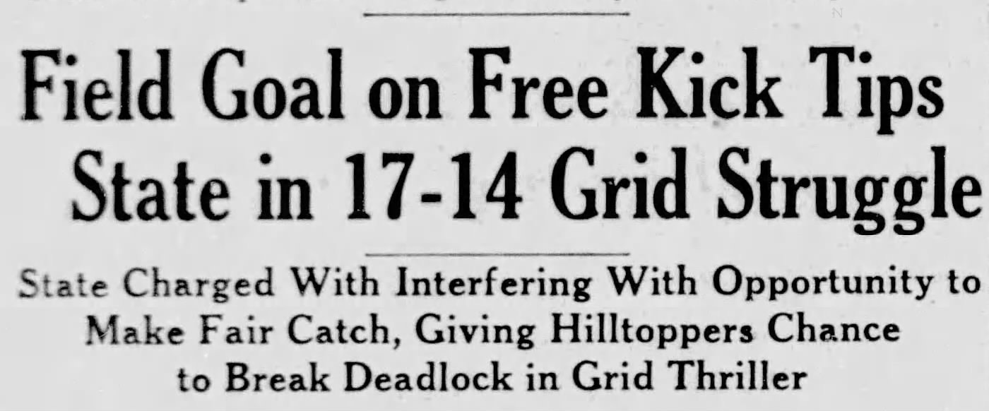With the fair catch seldom being used, the free kick after a fair catch was rarer still. Northwestern missed a last-second attempt versus Michigan in 1933, and Marquette beat Michigan State on another last-second free kick in 1939. Both attempts received media attention but were soon forgotten by many.