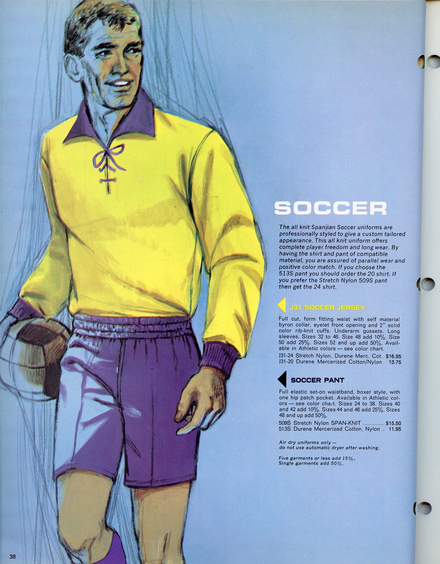Like the gymnastics uniforms, their soccer gear did not include the many stripe choices available with football jerseys and pants, but at least buyers could choose between stretch nylon and durene.