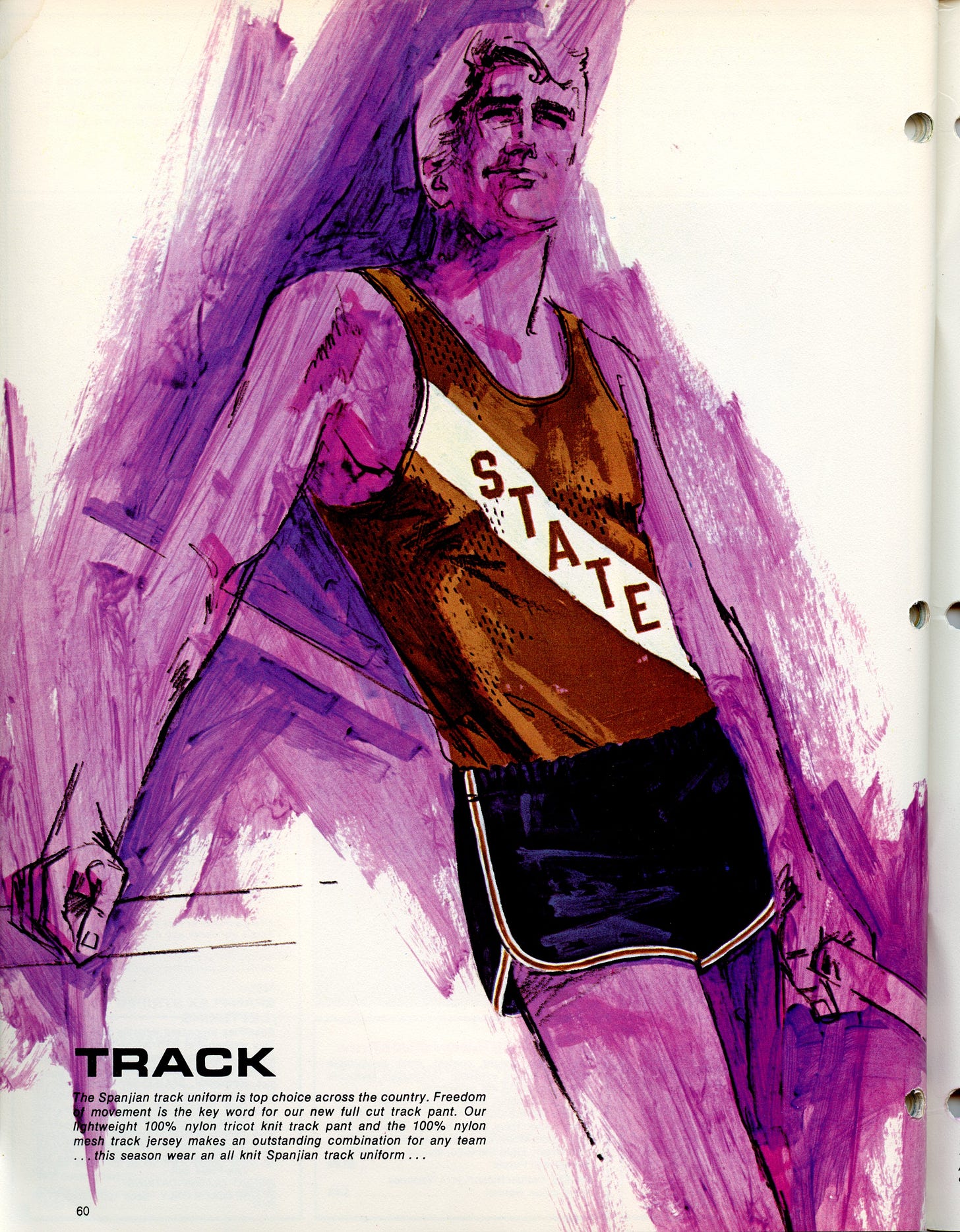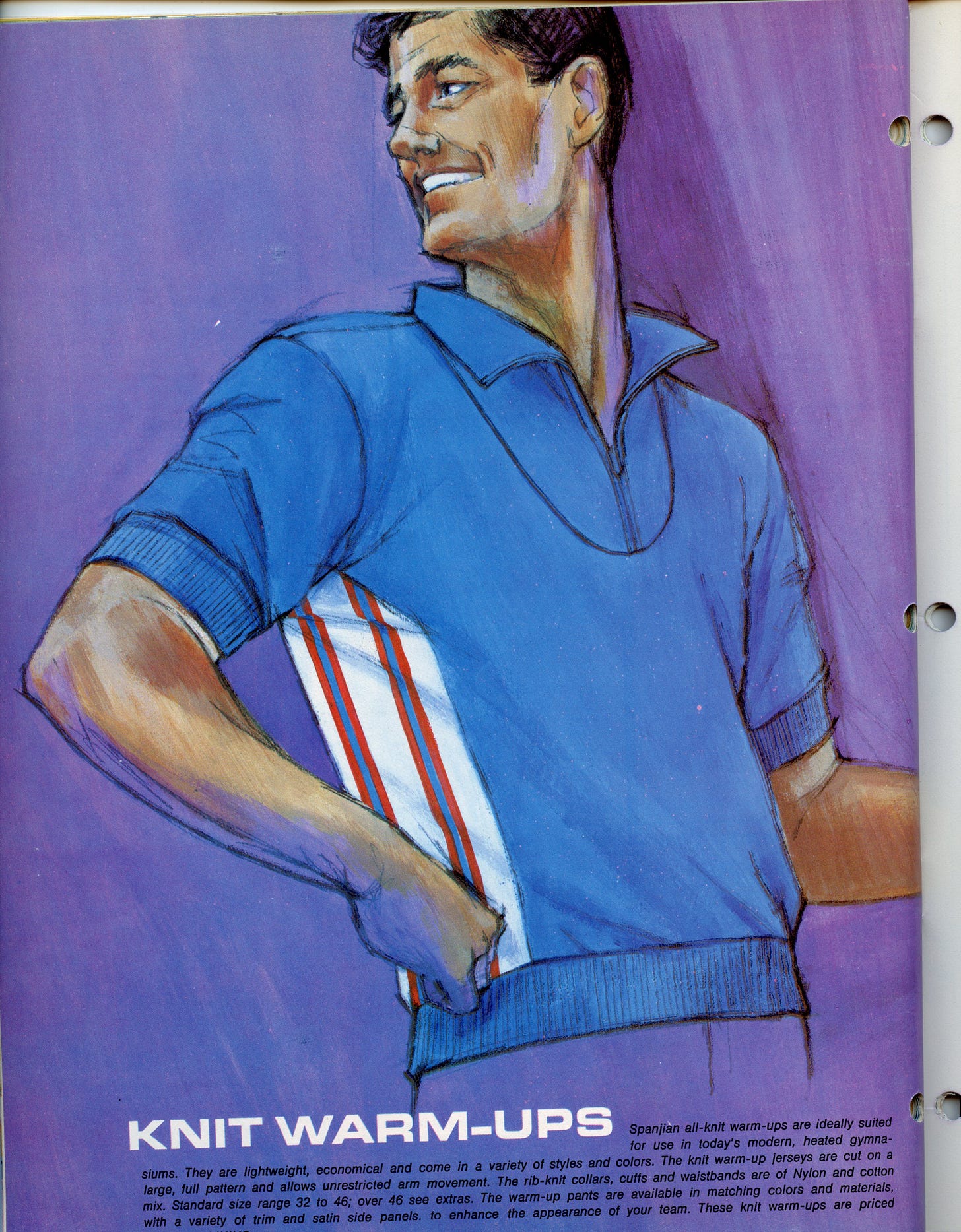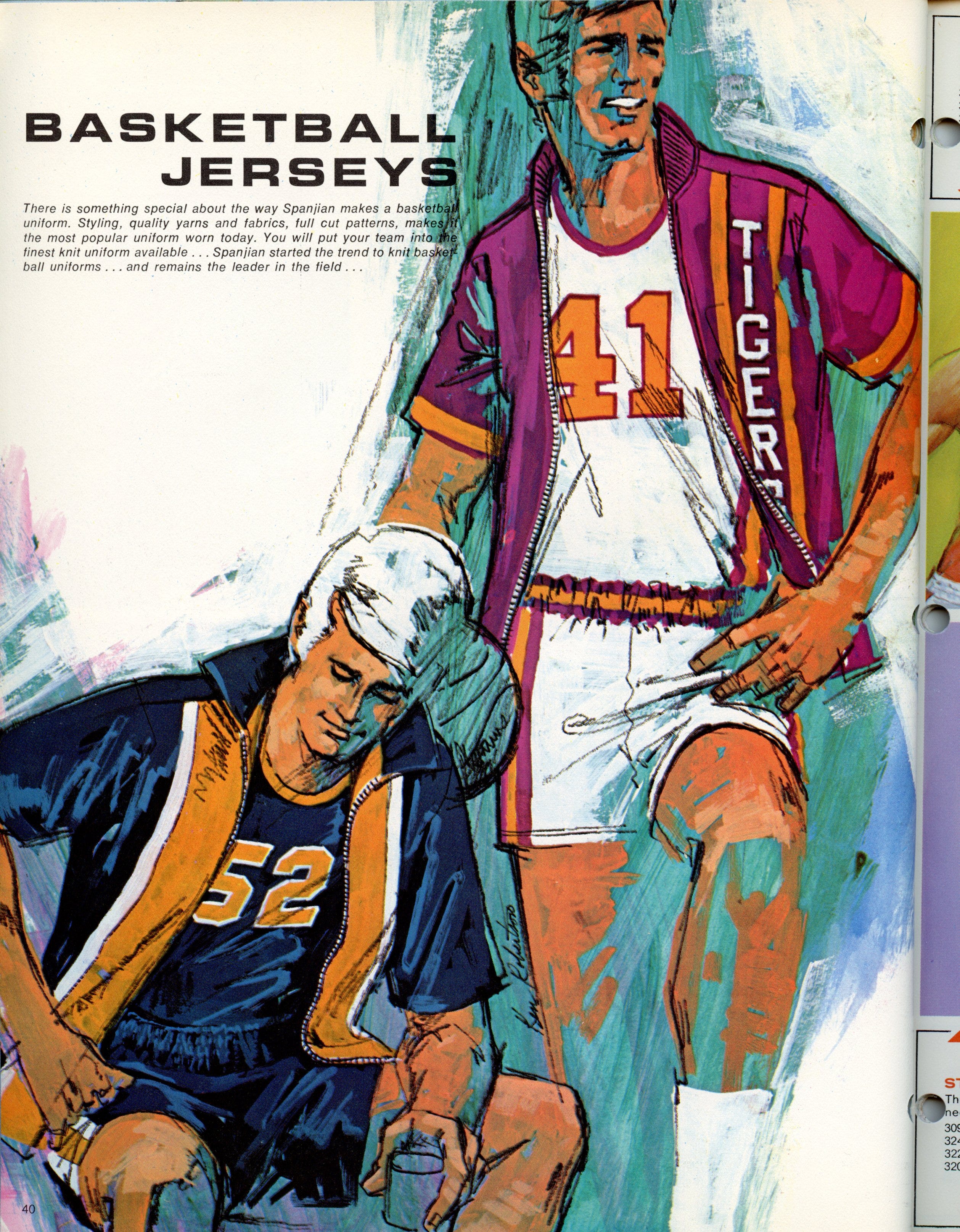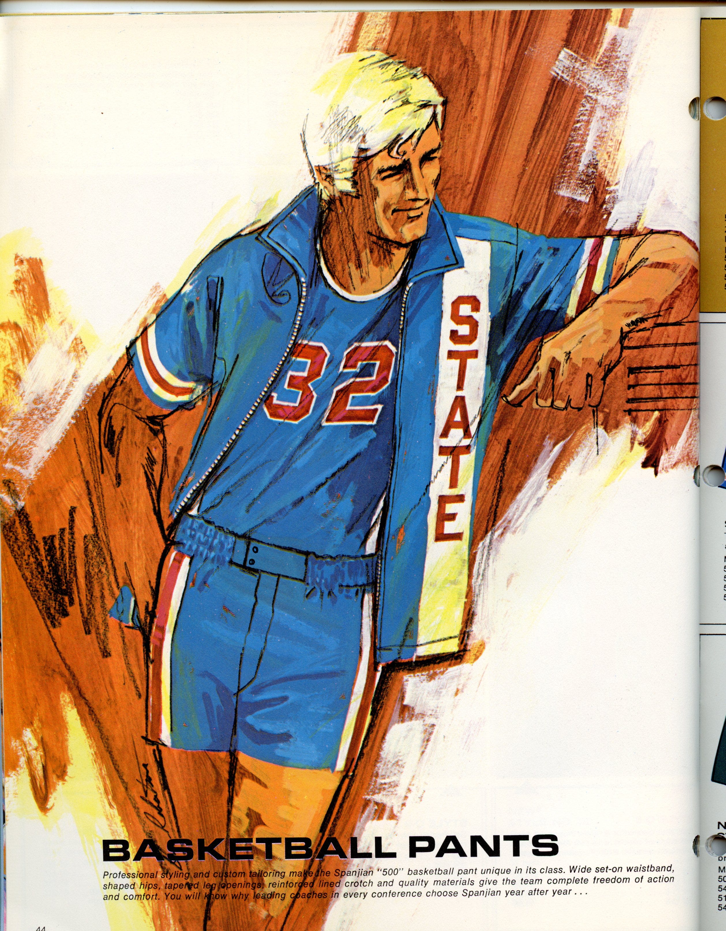 Basketball enjoyed a wider range of options. Spanjian claims they started the knit basketball uniform trend, and by 1971, they offered snazzy jerseys, pants, and warm-ups.