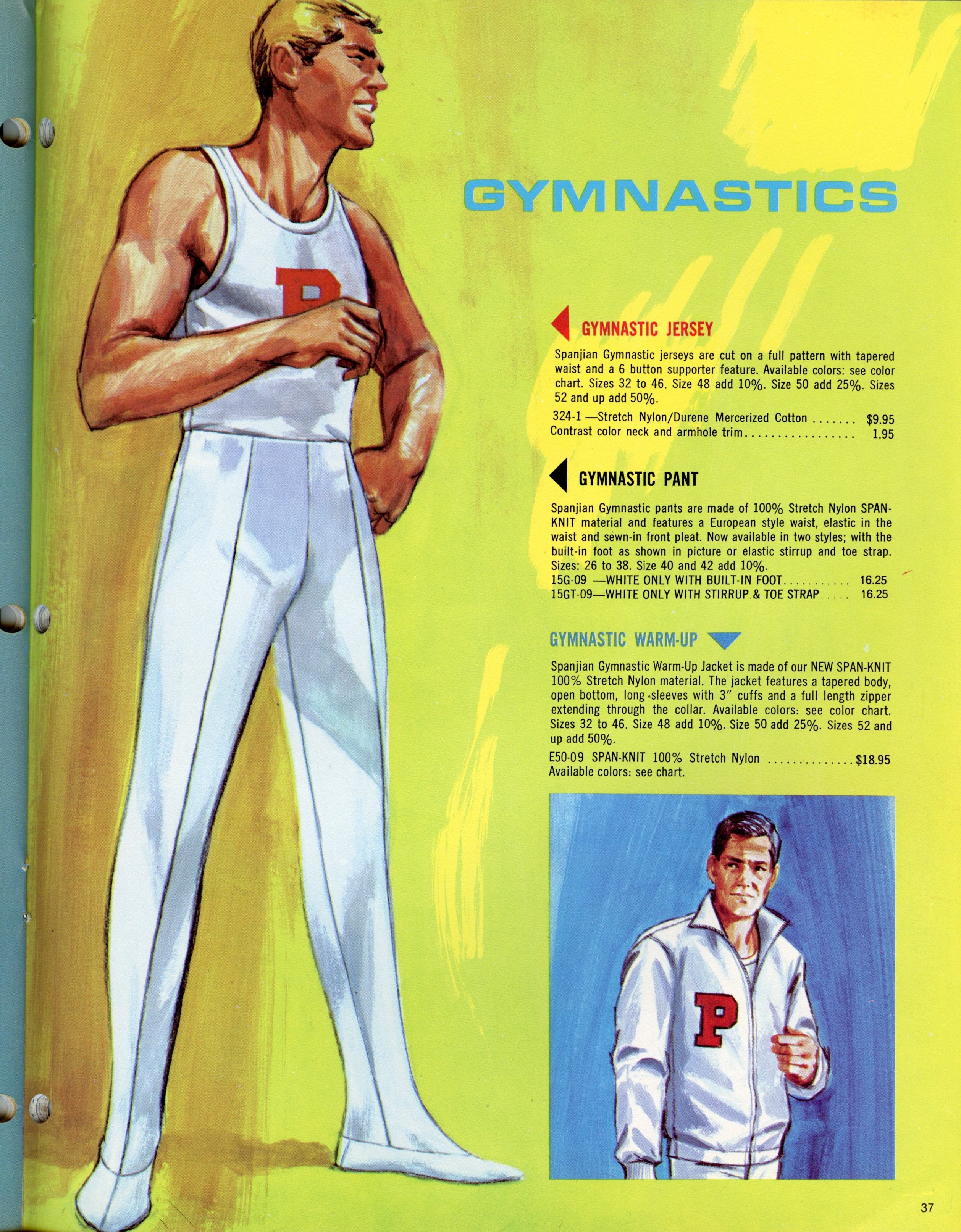 Next, we have gymnastics, where Spanjian offered goods only in white, though you could get the neck and armhole trim in your team color.