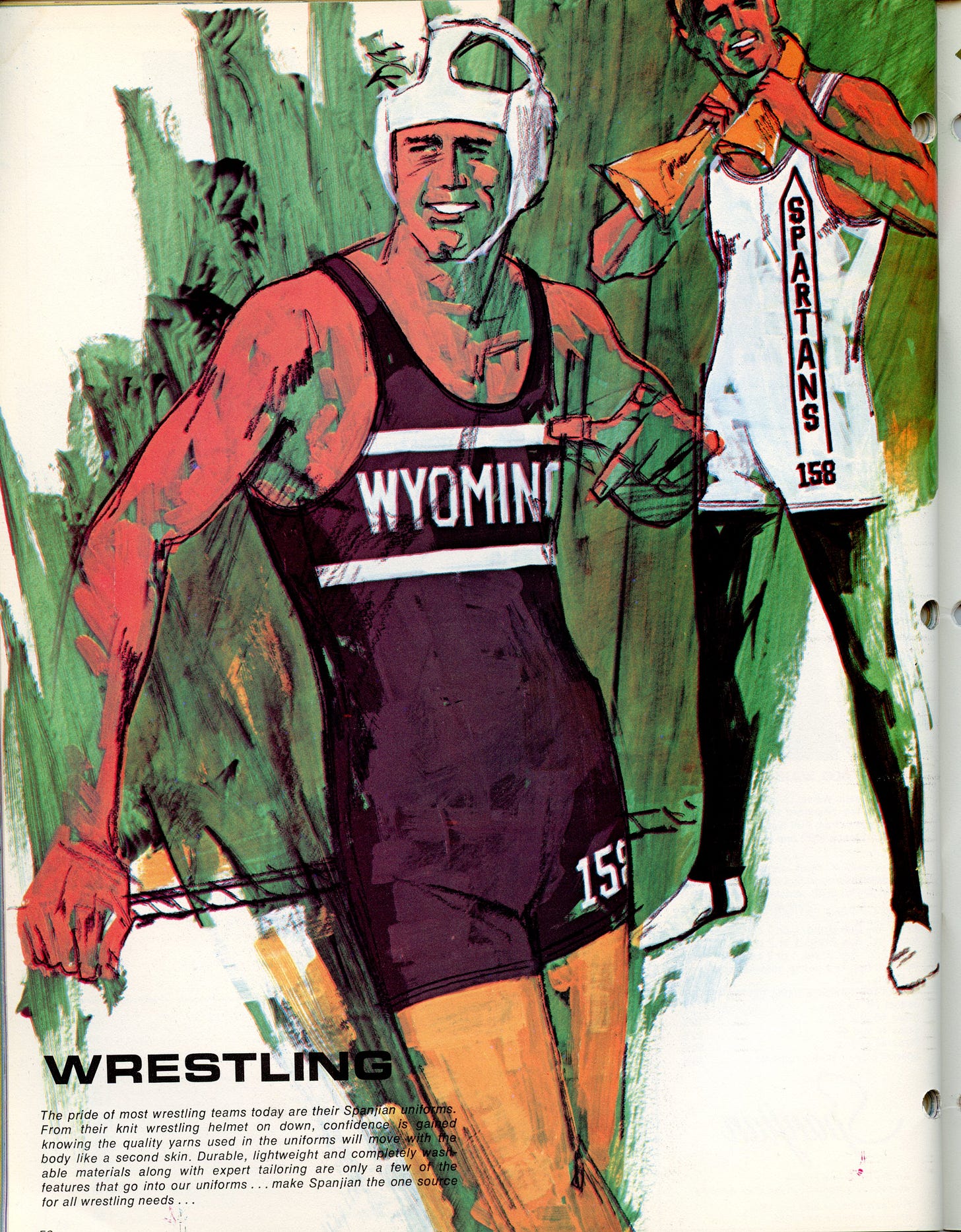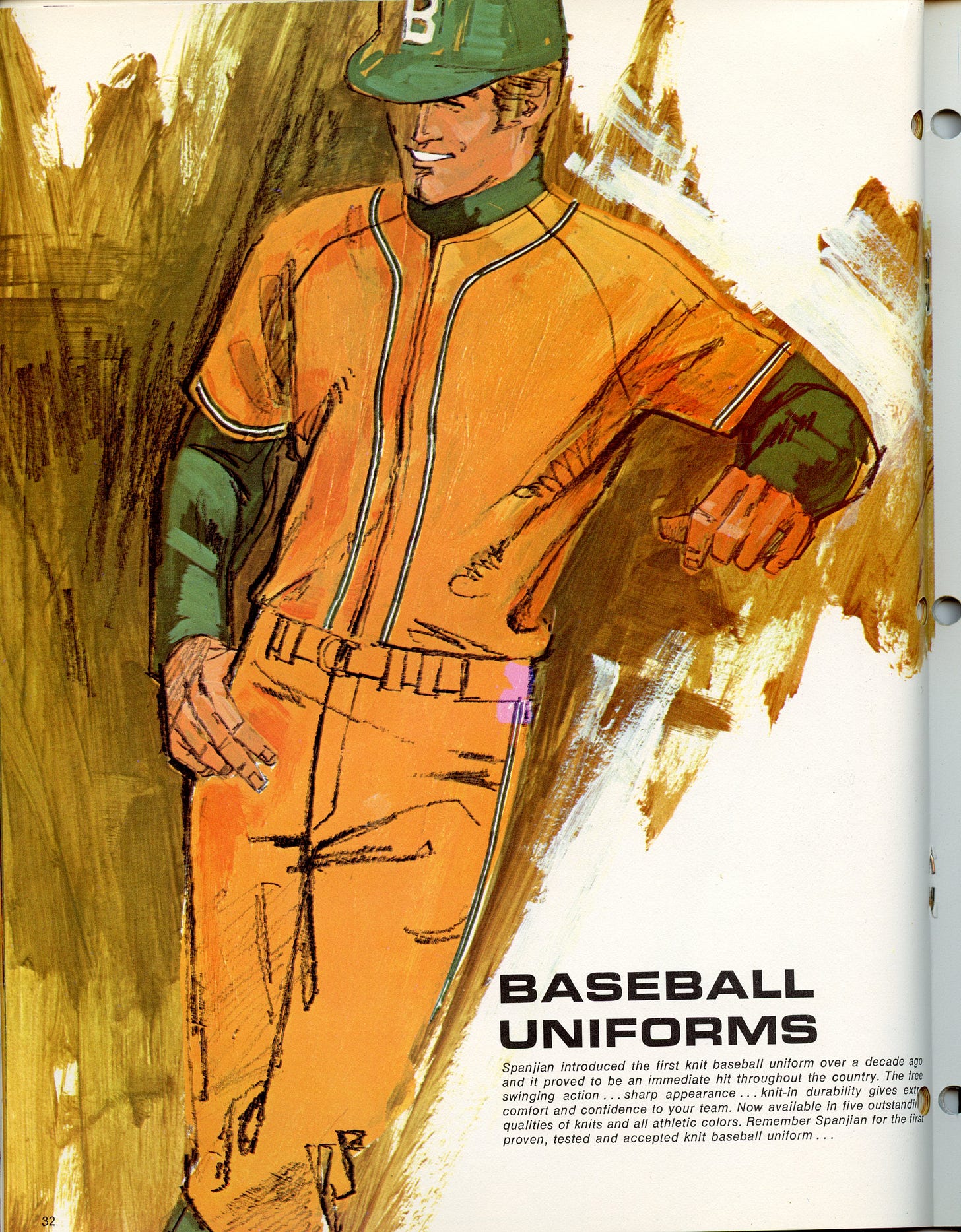 Our first sport is baseball, where they displayed an offering as radical as the bright yellow togs worn by the Oakland A’s of the time. Spanjian claims to have introduced baseball’s first knit uniform. If you never sweated your baseballs off in a flannel baseball uniform, you should thank Spanjian for reducing your discomfort under the noonday sun. Whether you should thank them for their artwork is up to your sense of taste, or lack thereof.