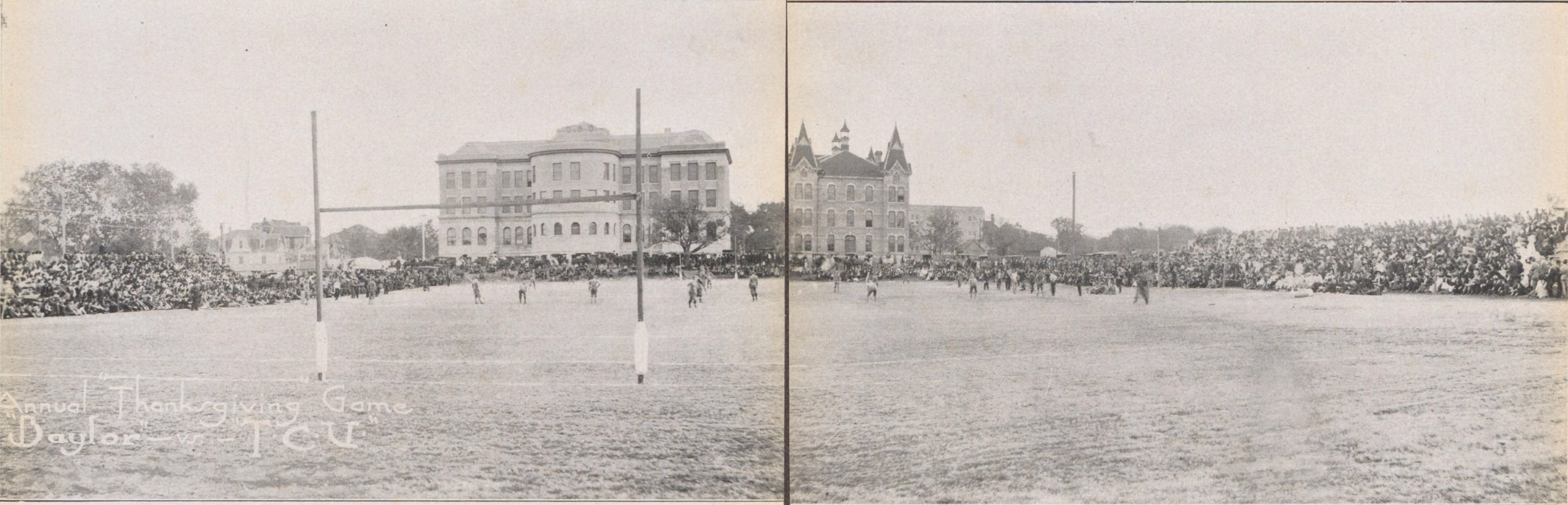Moving on to the football side of the story, Baylor's 1908 football team went 3-5, including an 89-0 loss to LSU, so the football following alums had to feel good that the 1909 team was 4-3 going into the Homecoming game against TCU. Of course, closer inspection would have revealed that Baylor had already lost to 5-1-1 TCU twice that season, going scoreless in recent 9-0 and 11-0 games. So, the pressure was there to play well in the Thanksgiving Day game in front of the biggest crowd the college had ever witnessed.