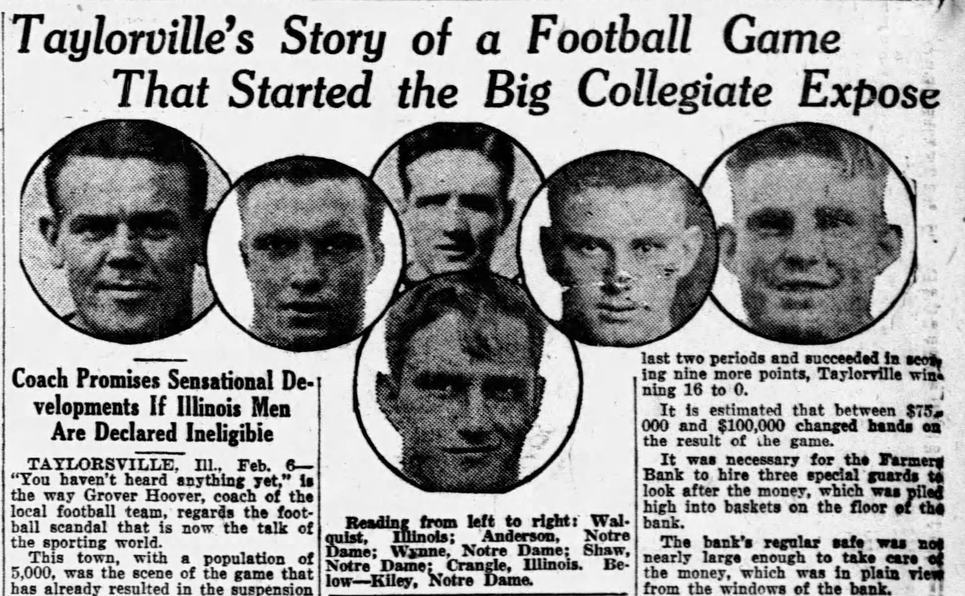 In the end, the Carlinville-Taylorville scandal was much ado about nothing. Many recruiting and payola scandals followed, and it would be another century before the college football world accepted that their players could be professionals and be paid for their notoriety, if not a share of the gate.