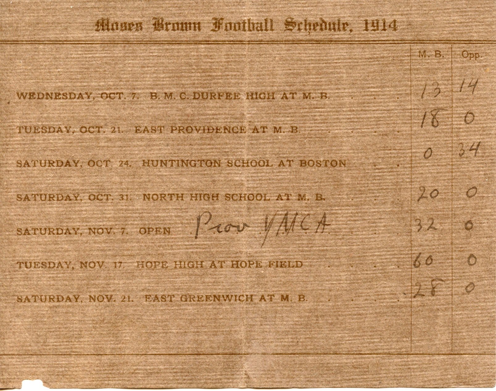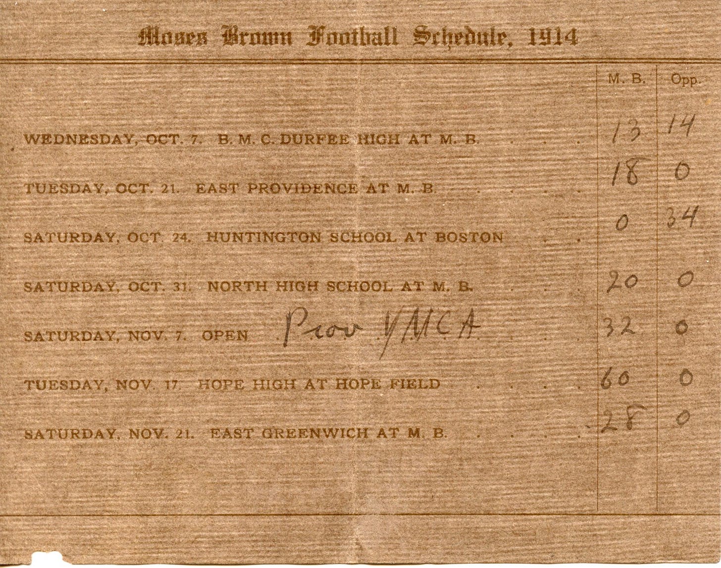 His inaugural season at Moses Brown proved successful, as shown by a copy of their schedule with scores filled in. However, period newspaper articles indicate they played and lost another game or two that do not appear on the schedule.