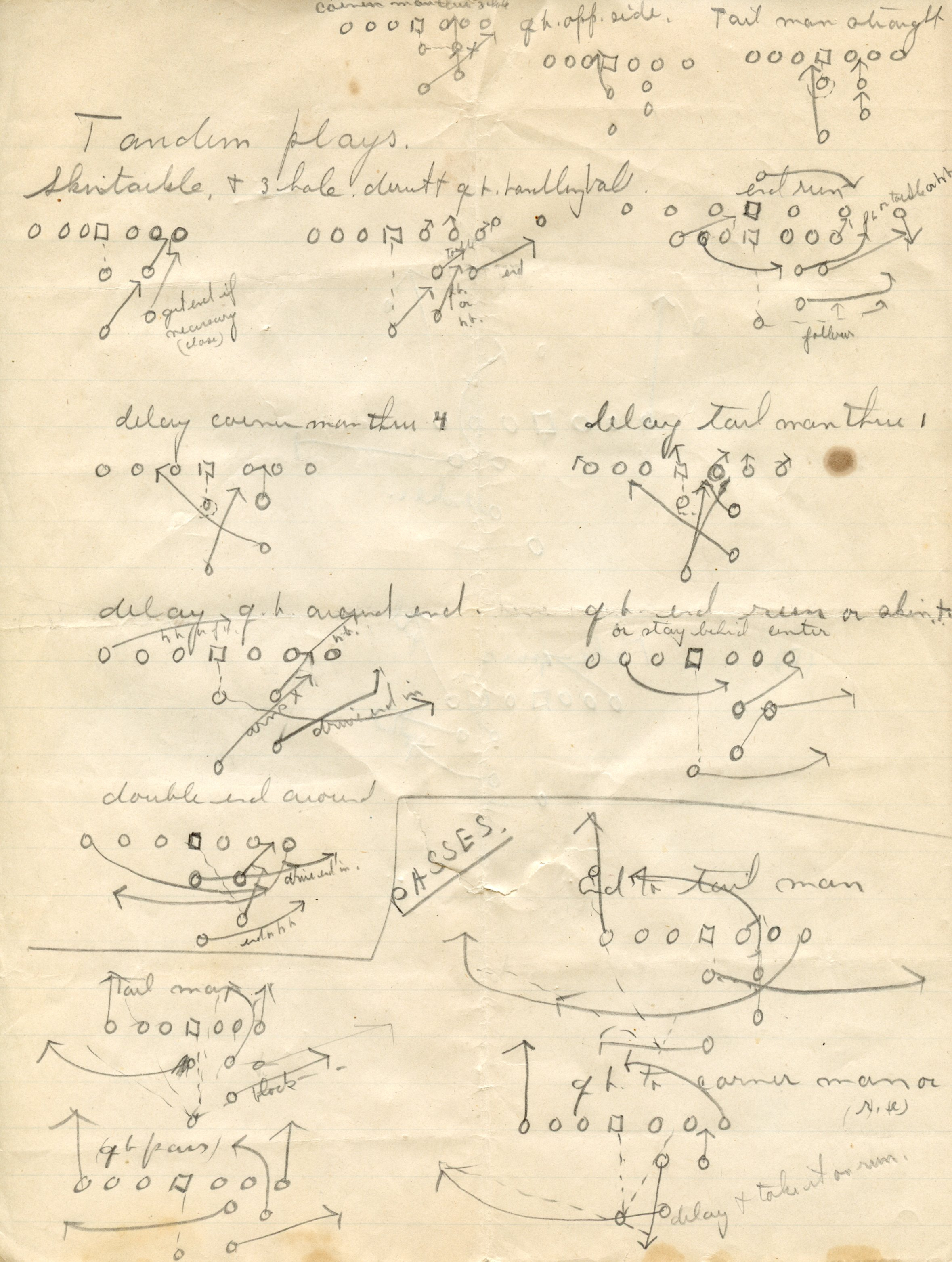 Whether Moses Brown succeeded due to talent or coaching is difficult to know 110 years later, but we gain some insight into Thompson’s coaching from nine pages of the Moses Brown playbook that was packaged with the schedule. The pages are likely a team member’s handwritten and hand-drawn notes from Coach Thompson-led chalk talks, since that was common practice before mimeograph machines.